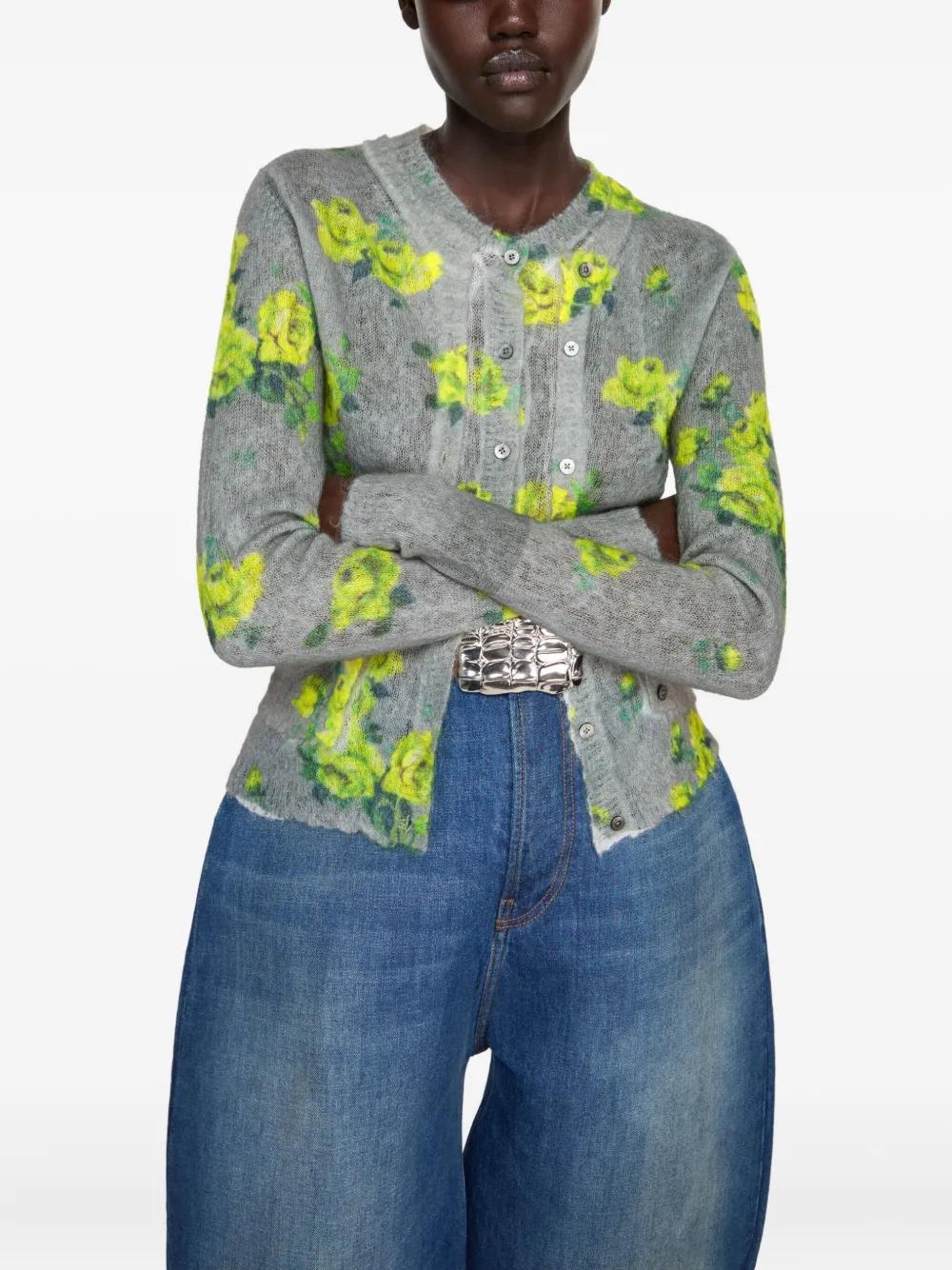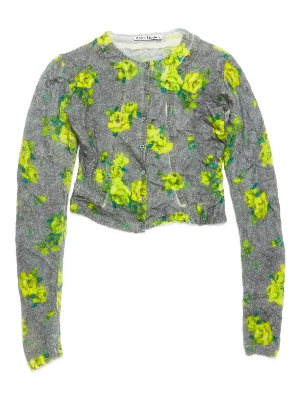 medium grey front button fastening all-over floral print ribbed trim round neck