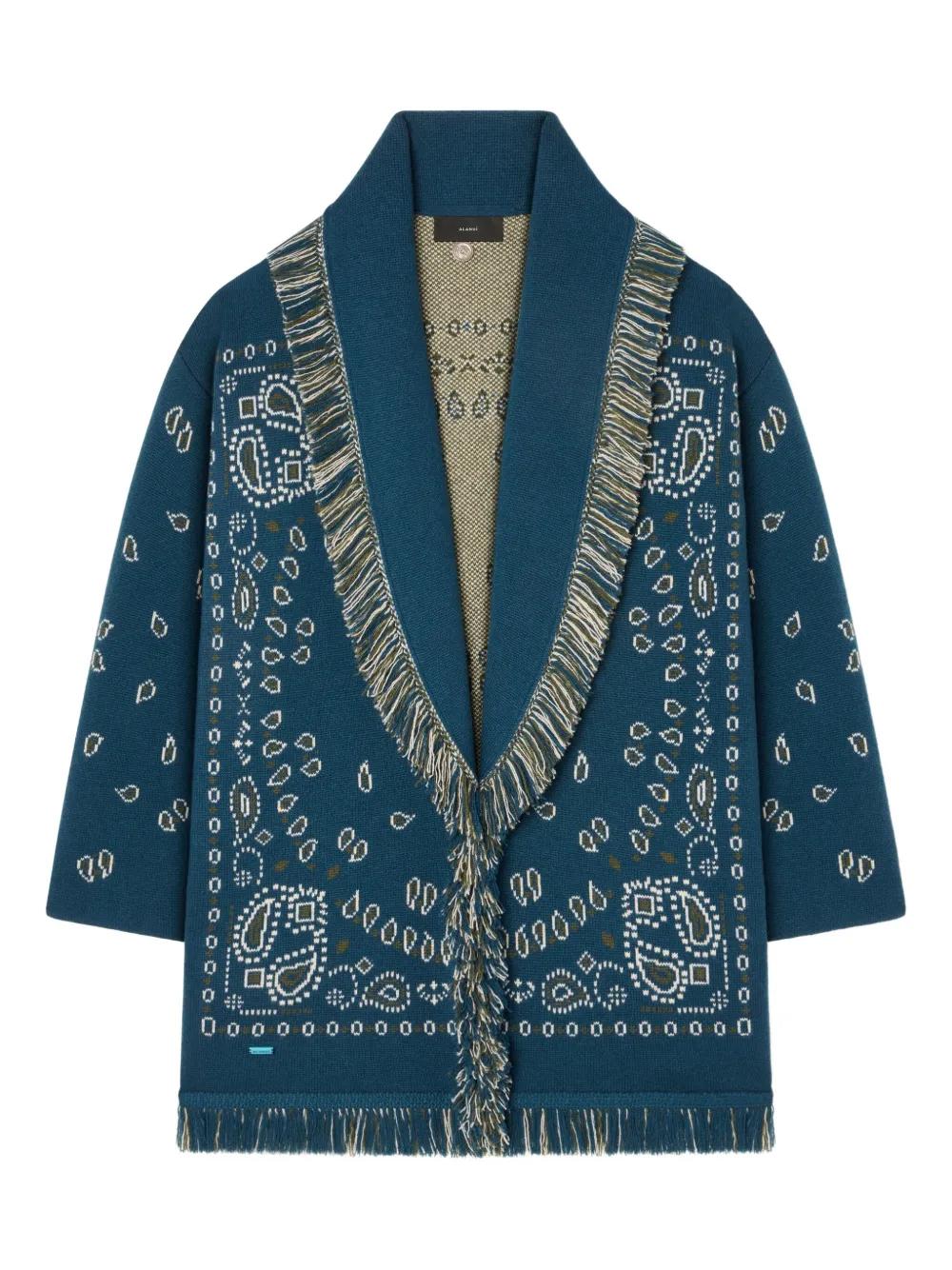 teal blue paisley pattern frayed trim open front long sleeves jacquard
