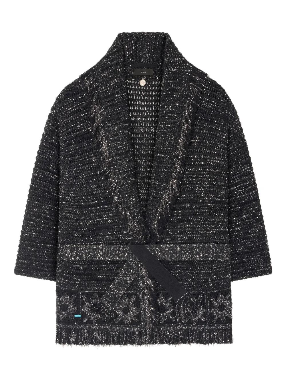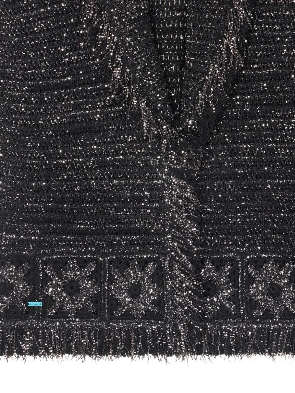 black sequin embellishment fringed trim belted waist ribbed knit geometric pattern