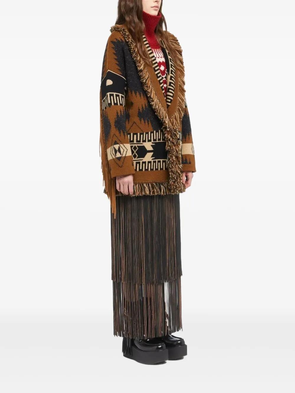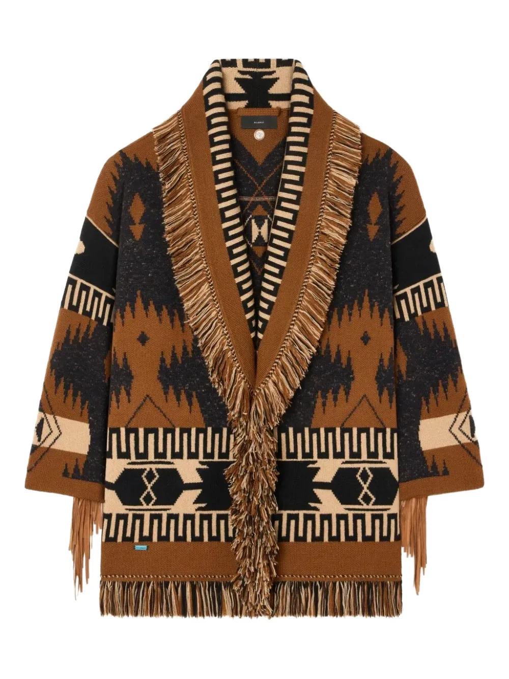 beige geometric pattern fringed trim shawl lapels detachable belt mid-length sleeves
