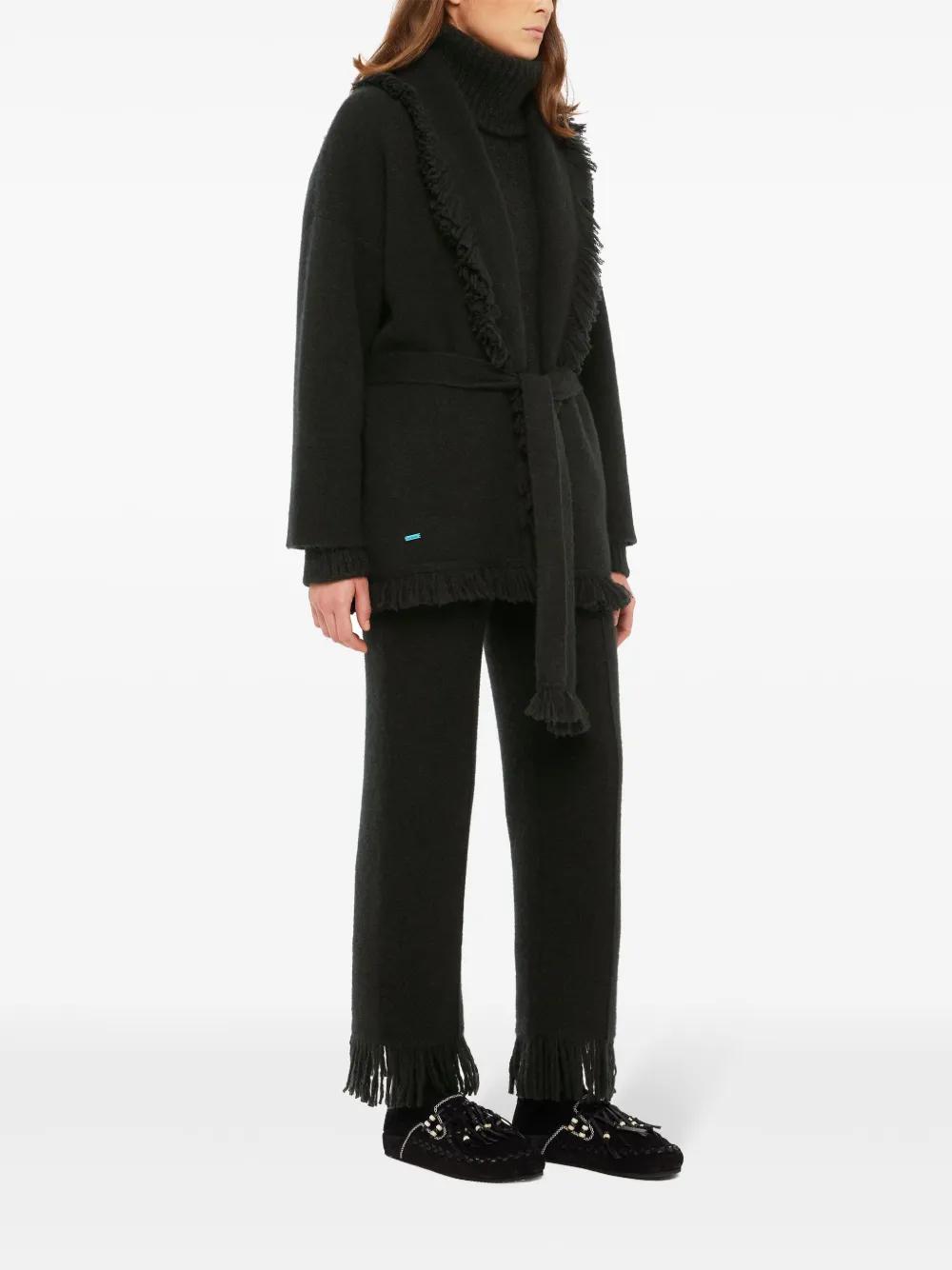 black cashmere blend knitted construction fringed edge shawl lapels plunging V-neck detachable and adjustable waist belt drop shoulder long sleeves straight hem