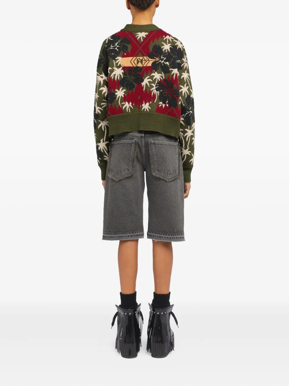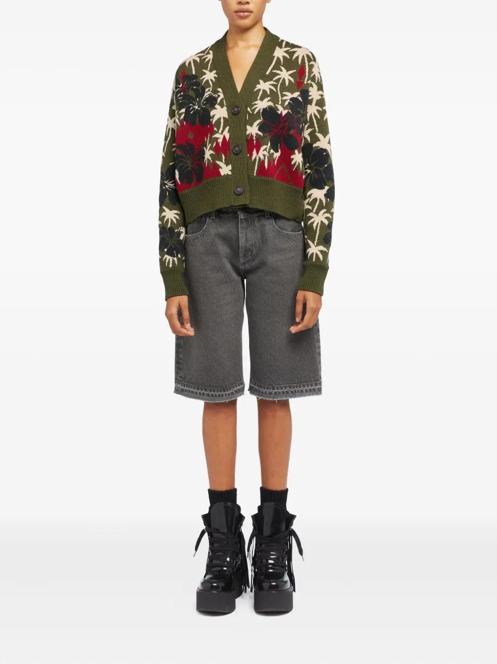 olive green hibiscus flower pattern palm tree pattern button fastening cropped virgin wool