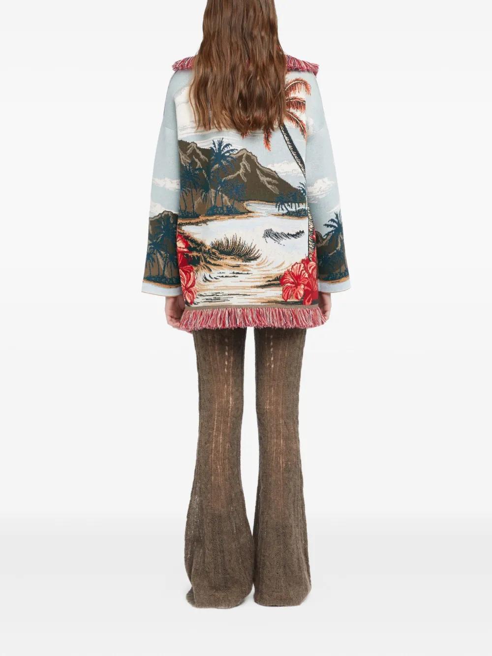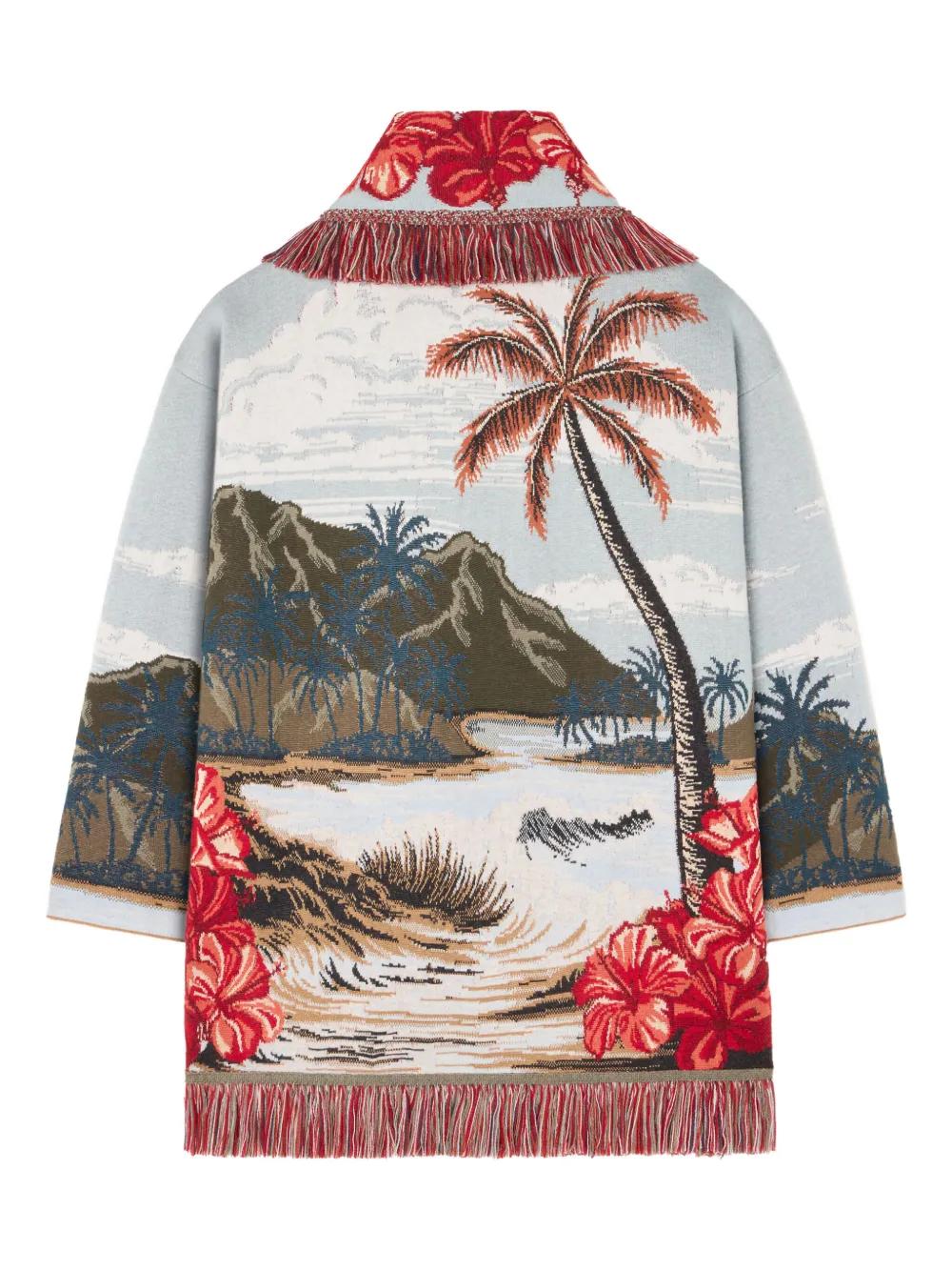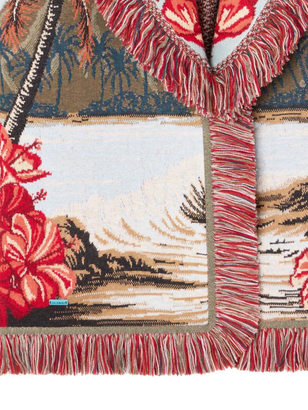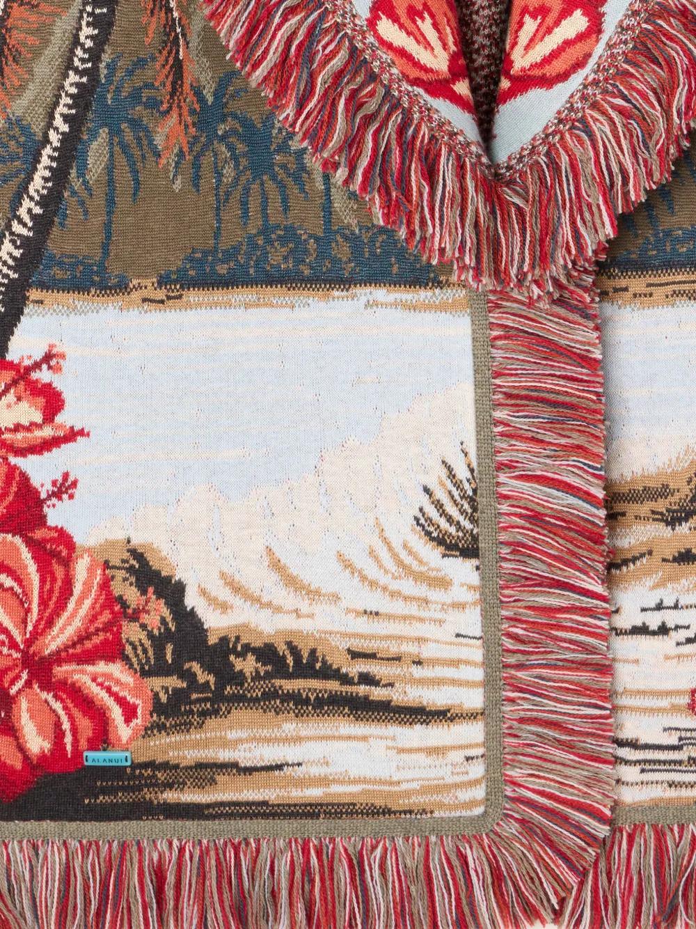 light blue Hidden Bay tapestry red hibiscus flower detail fringed trim self-tie belt three-quarter sleeves