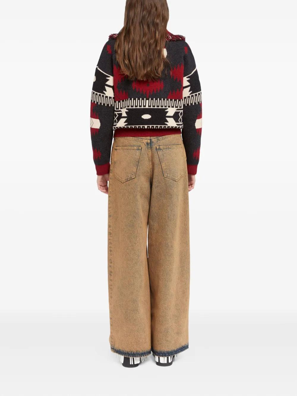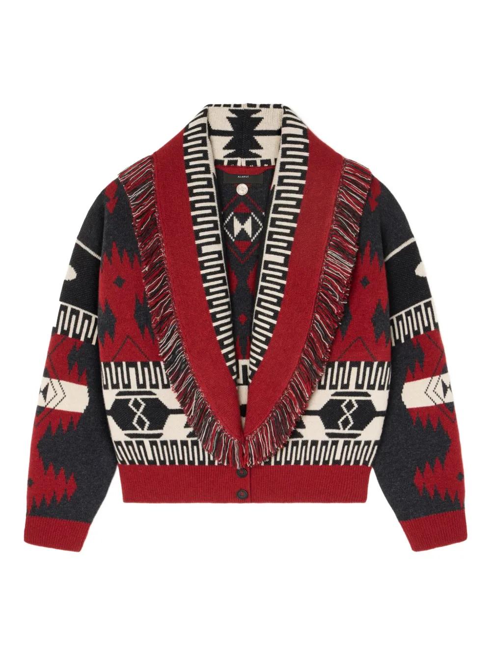red jacquard pattern fringe trim shawl collar button fastening long sleeves