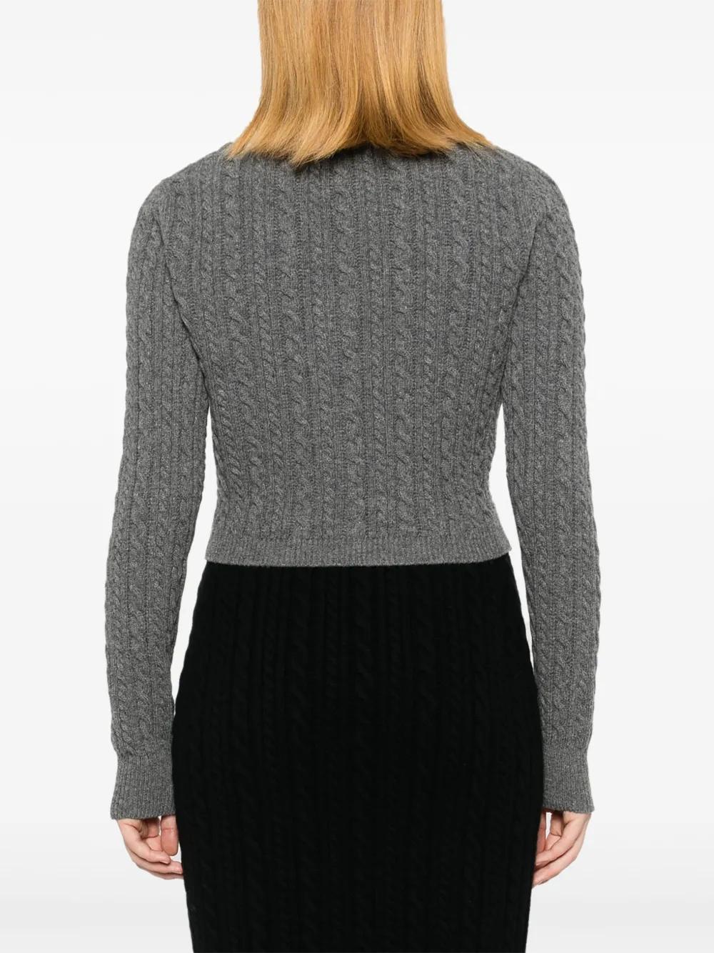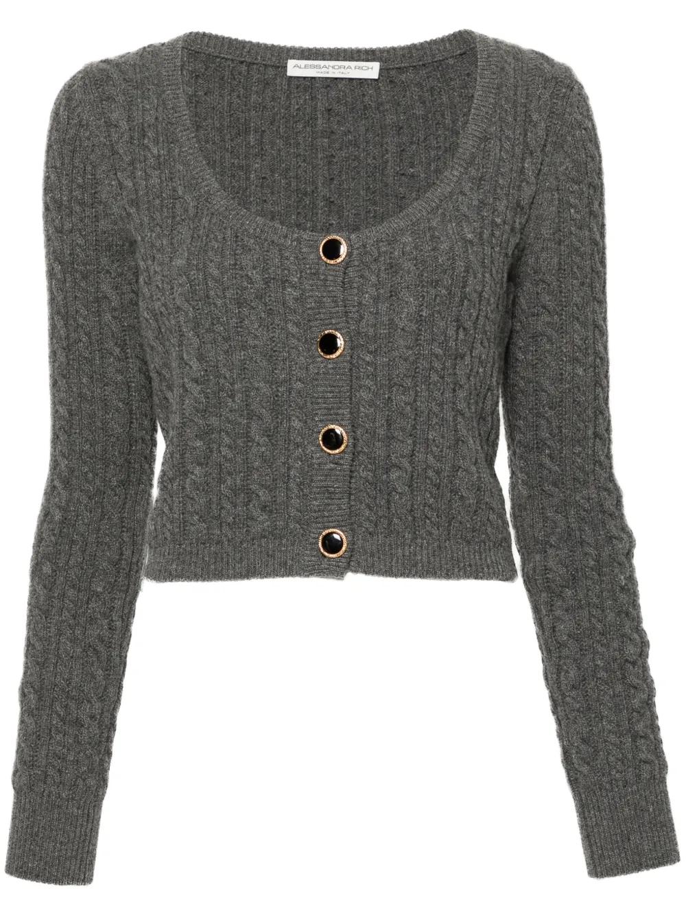 dark grey wool knitted construction cable knit round neck long sleeves ribbed cuffs and hem straight hem cropped front button fastening