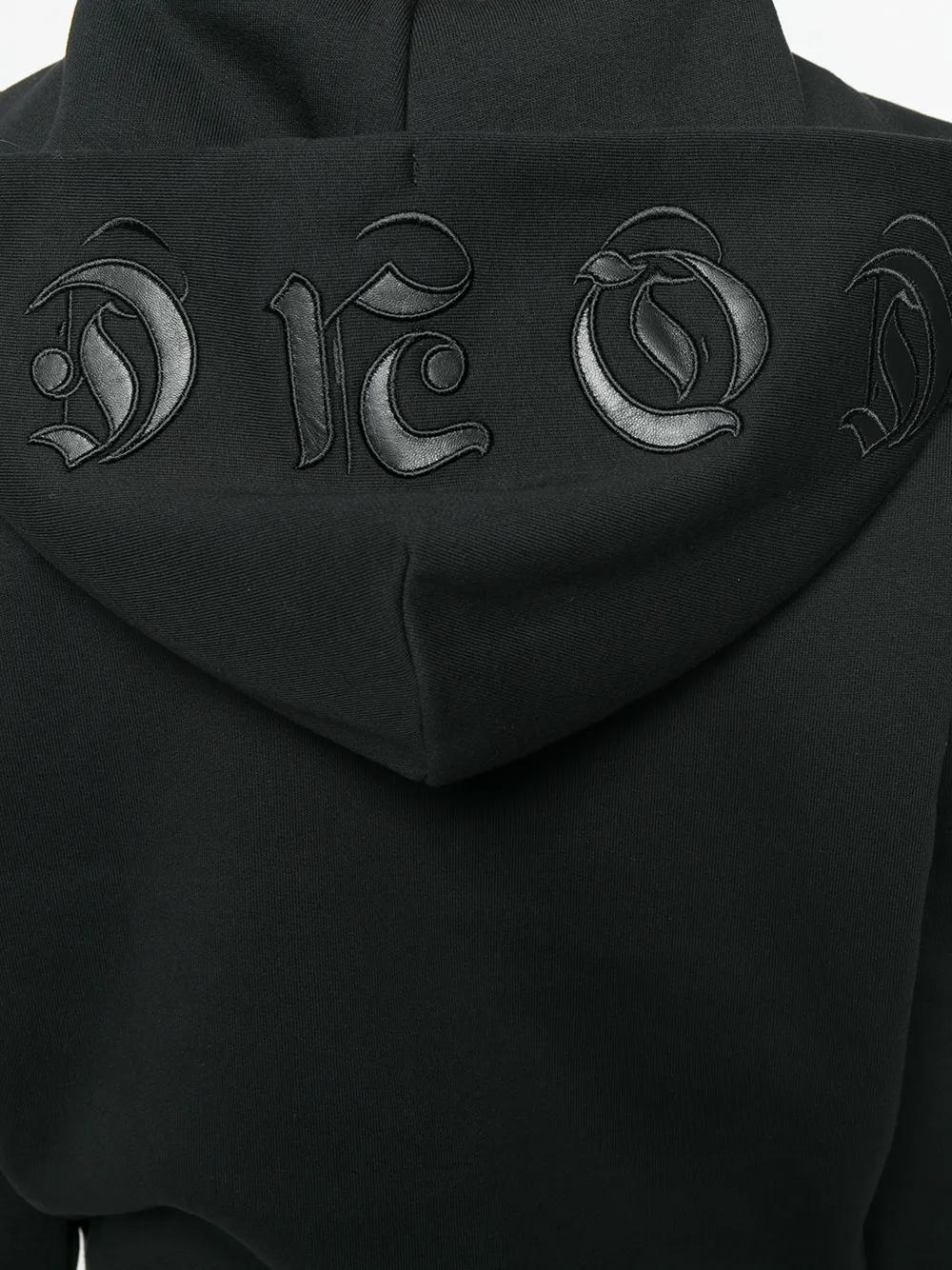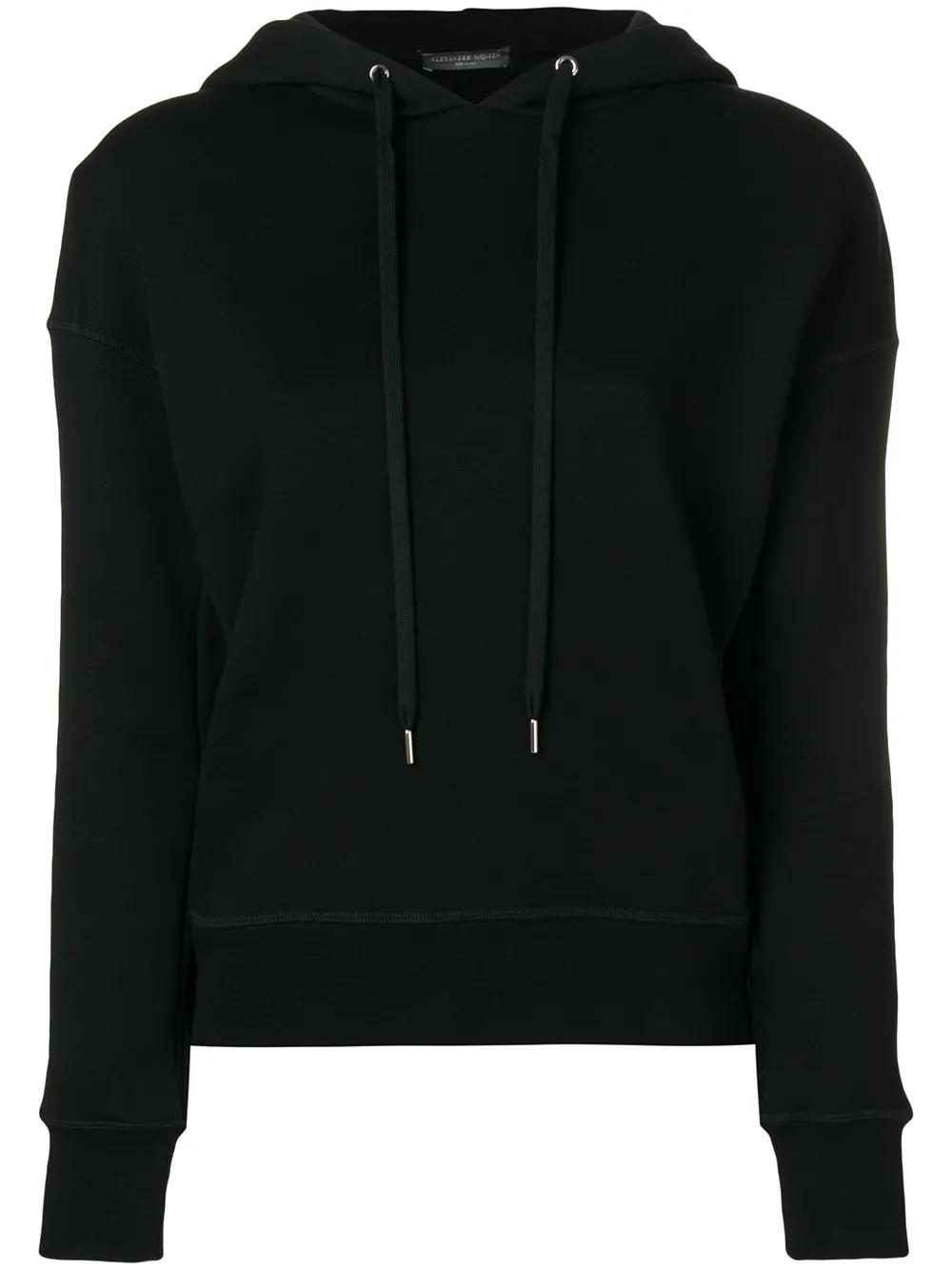 Who can twist and turn a garment, turning it into a high fashion masterpiece? Take this black cotton and lambskin blend regular hoodie from Alexander McQueen, featuring a drawstring hood, dropped shoulders, a ribbed hem and cuffs and an embroidered design on the hood.