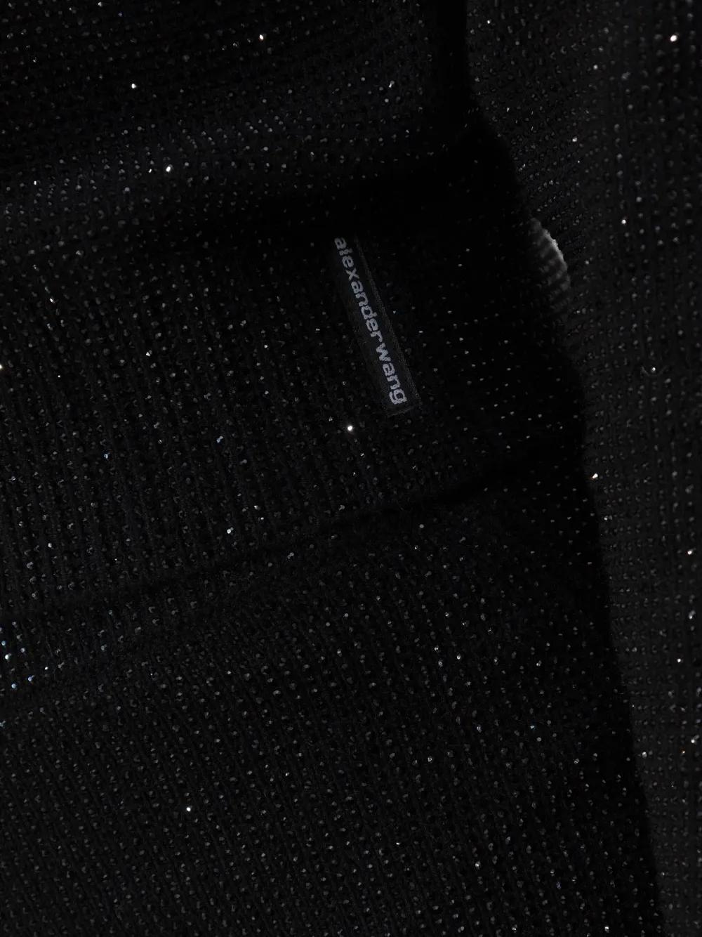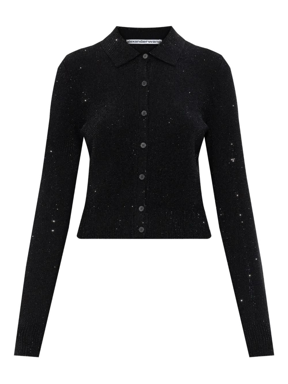 black front button fastening ribbed cuffs and hem crew neck rhinestone embellishment
