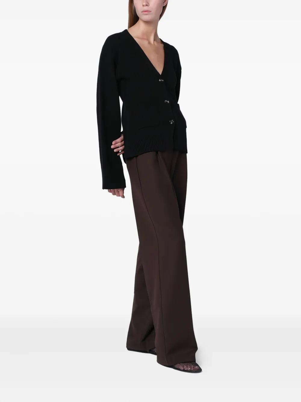 black v-neck front button fastening long sleeves two front patch pockets ribbed hem