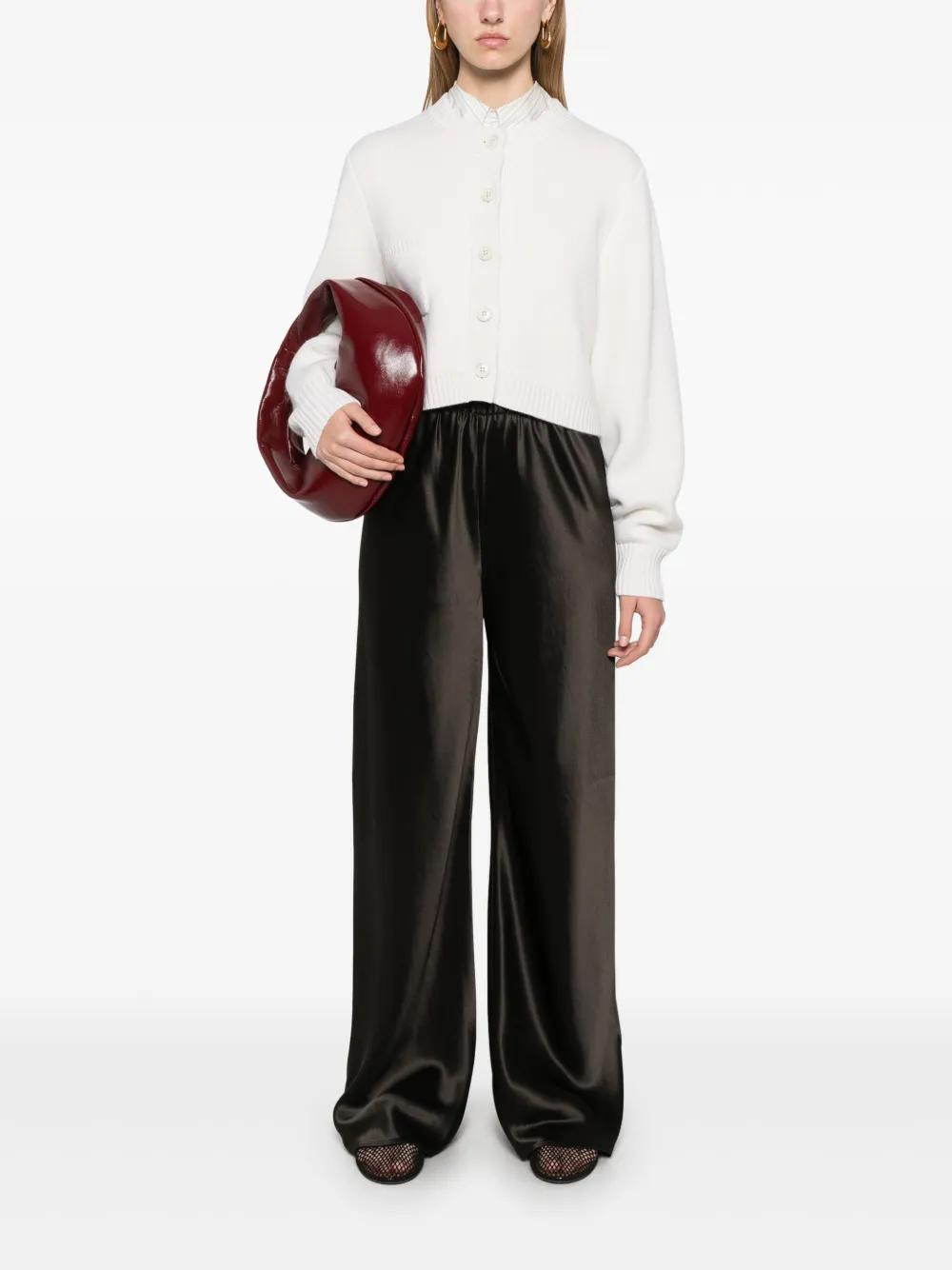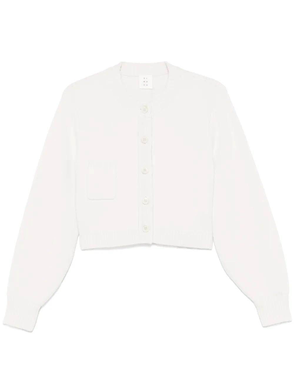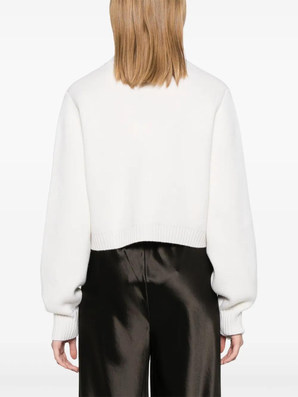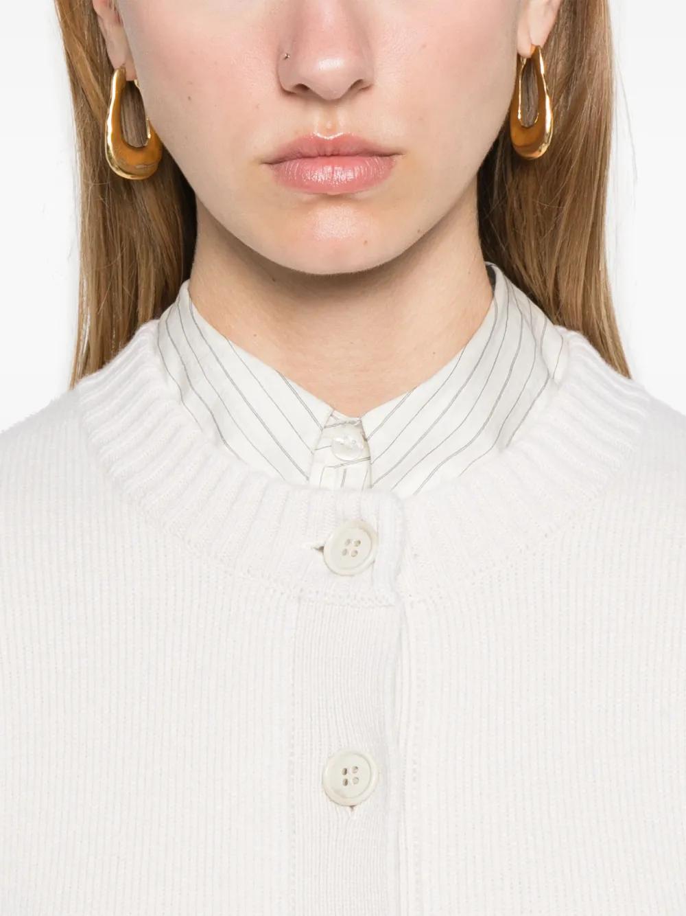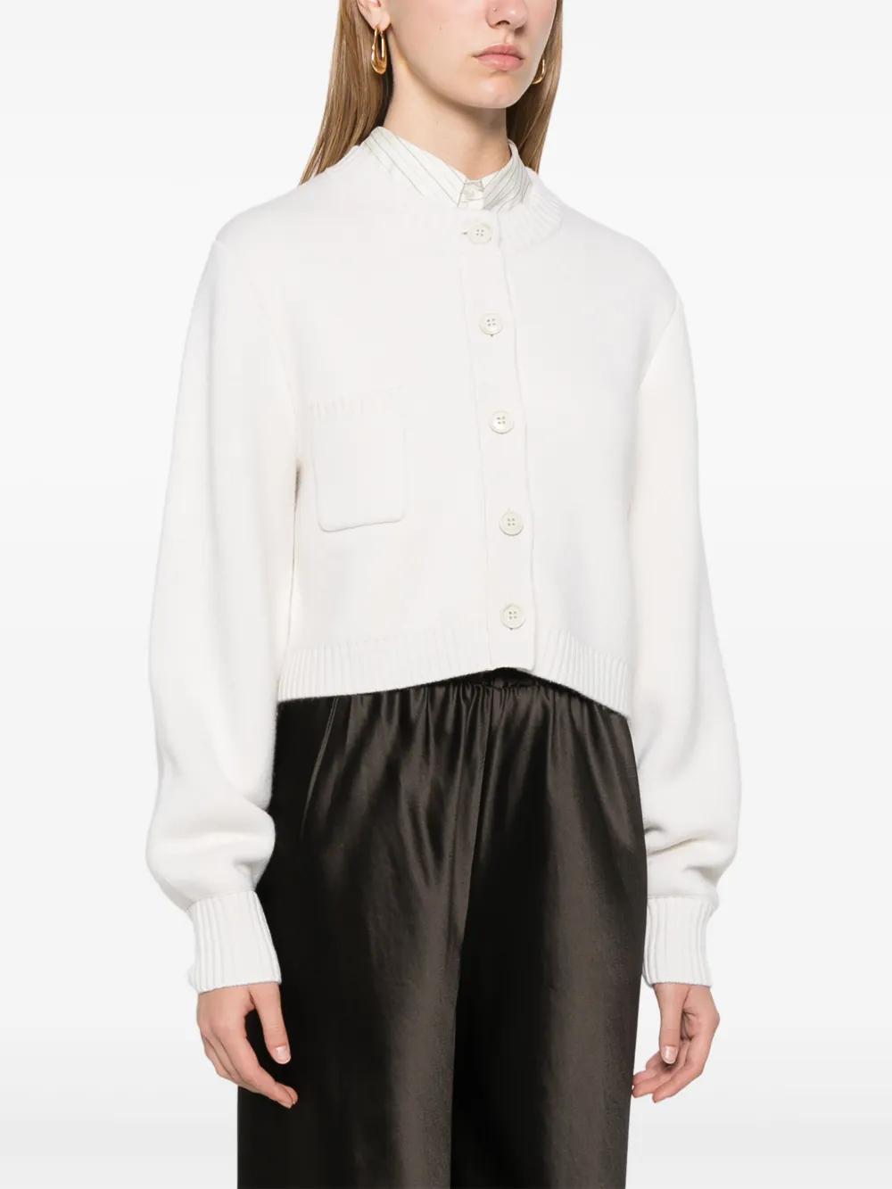 white merino wool blend ribbed knit front button fastening crew neck long sleeves front patch pocket straight hem
