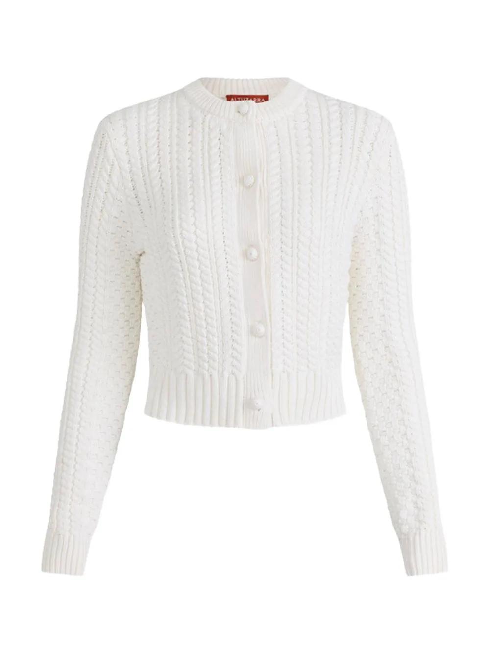 white cable knit button fastening round neck ribbed hem ribbed cuffs
