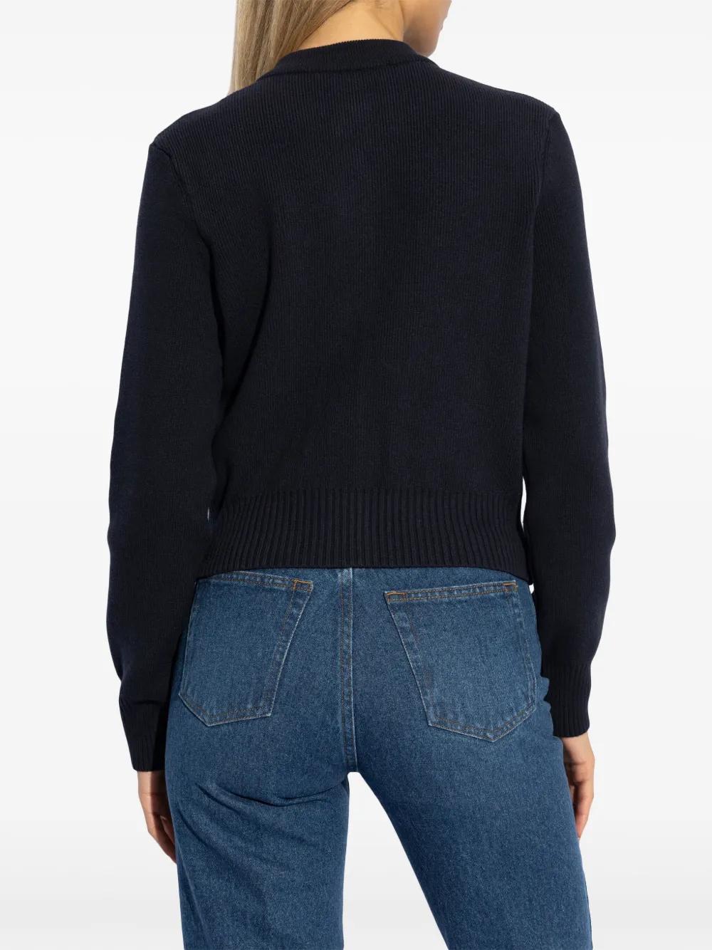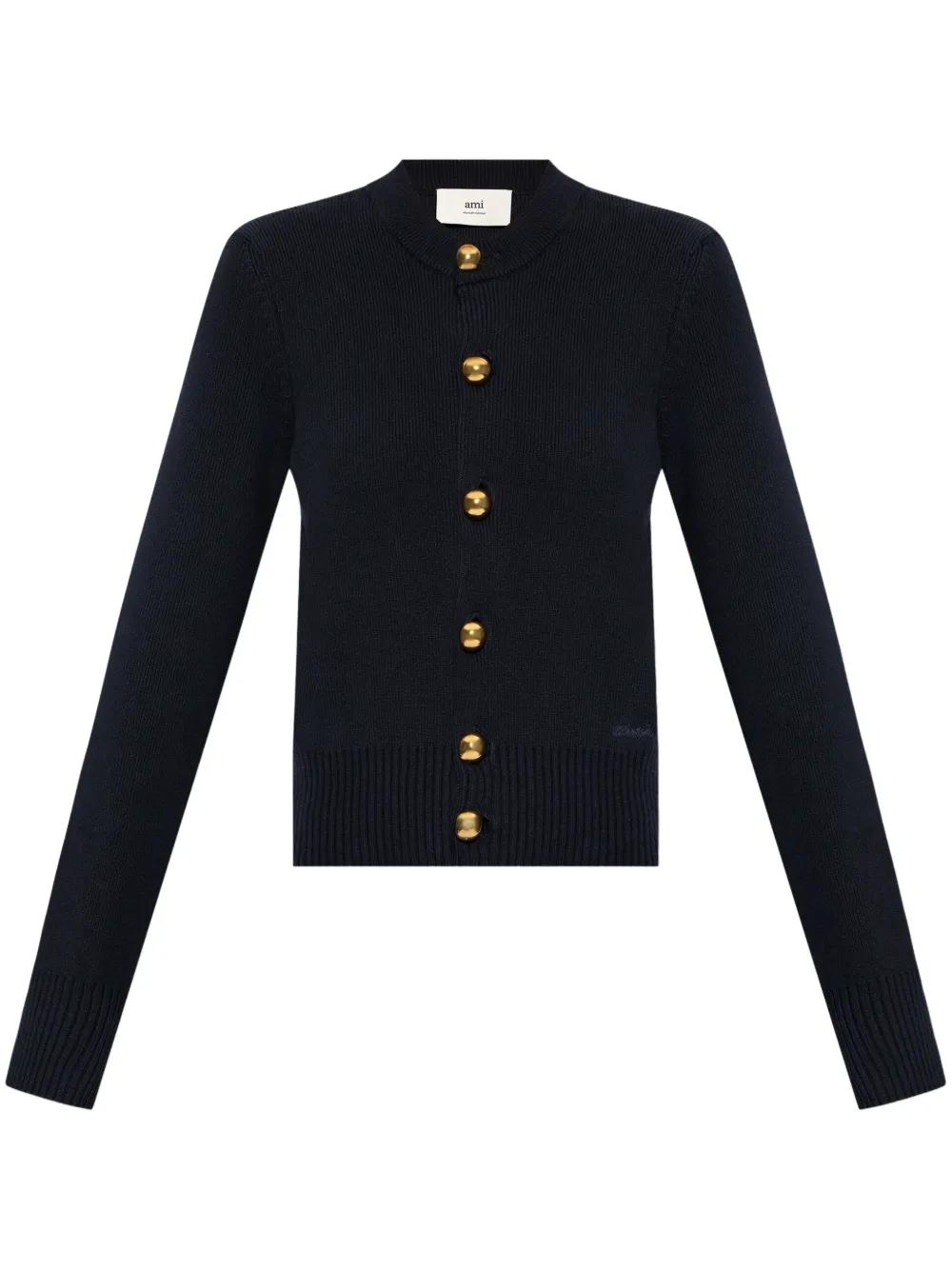 midnight blue organic cotton-wool blend ribbed knit embroidered logo to the side gold-tone buttons ribbed trim crew neck front button fastening long sleeves straight hem