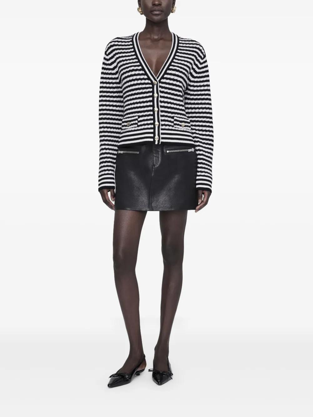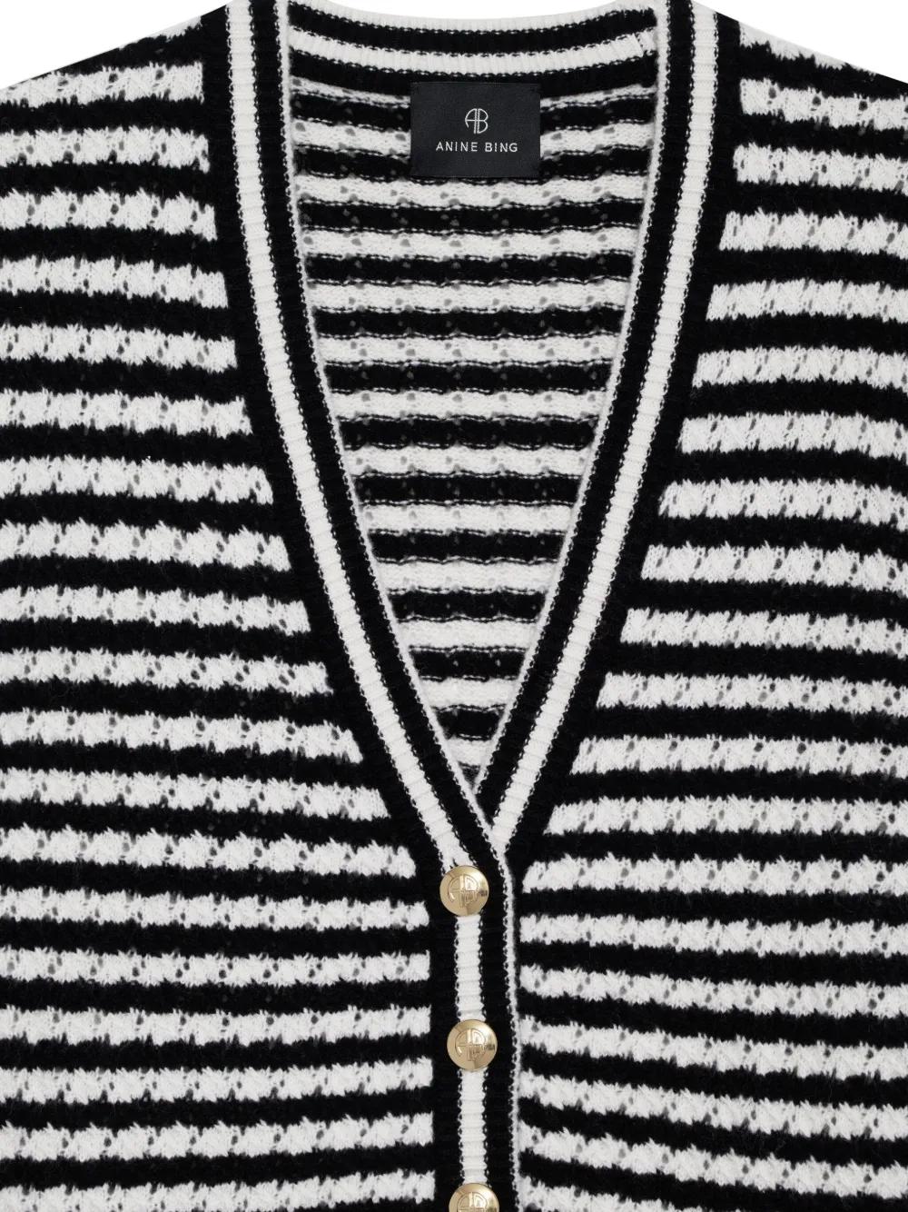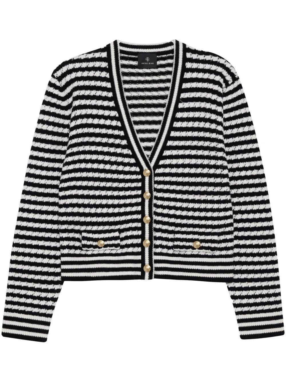black horizontal stripe pattern front button fastening ribbed cuffs and hem logo-embossed buttons