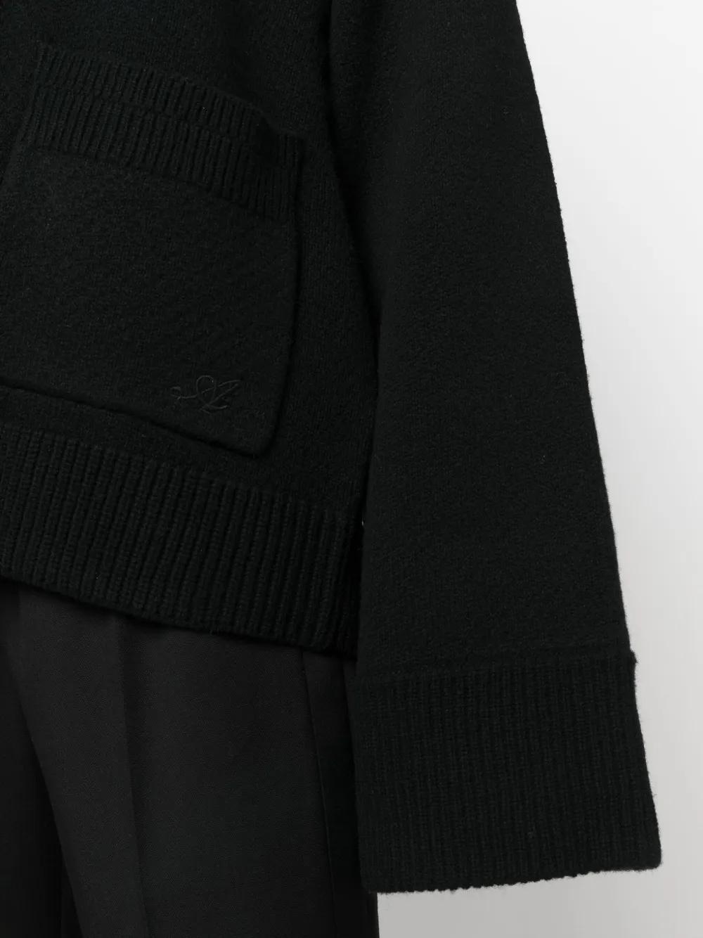 black lambs wool knitted construction V-neck front button fastening two front patch pockets drop shoulder long wide sleeves ribbed cuffs and hem