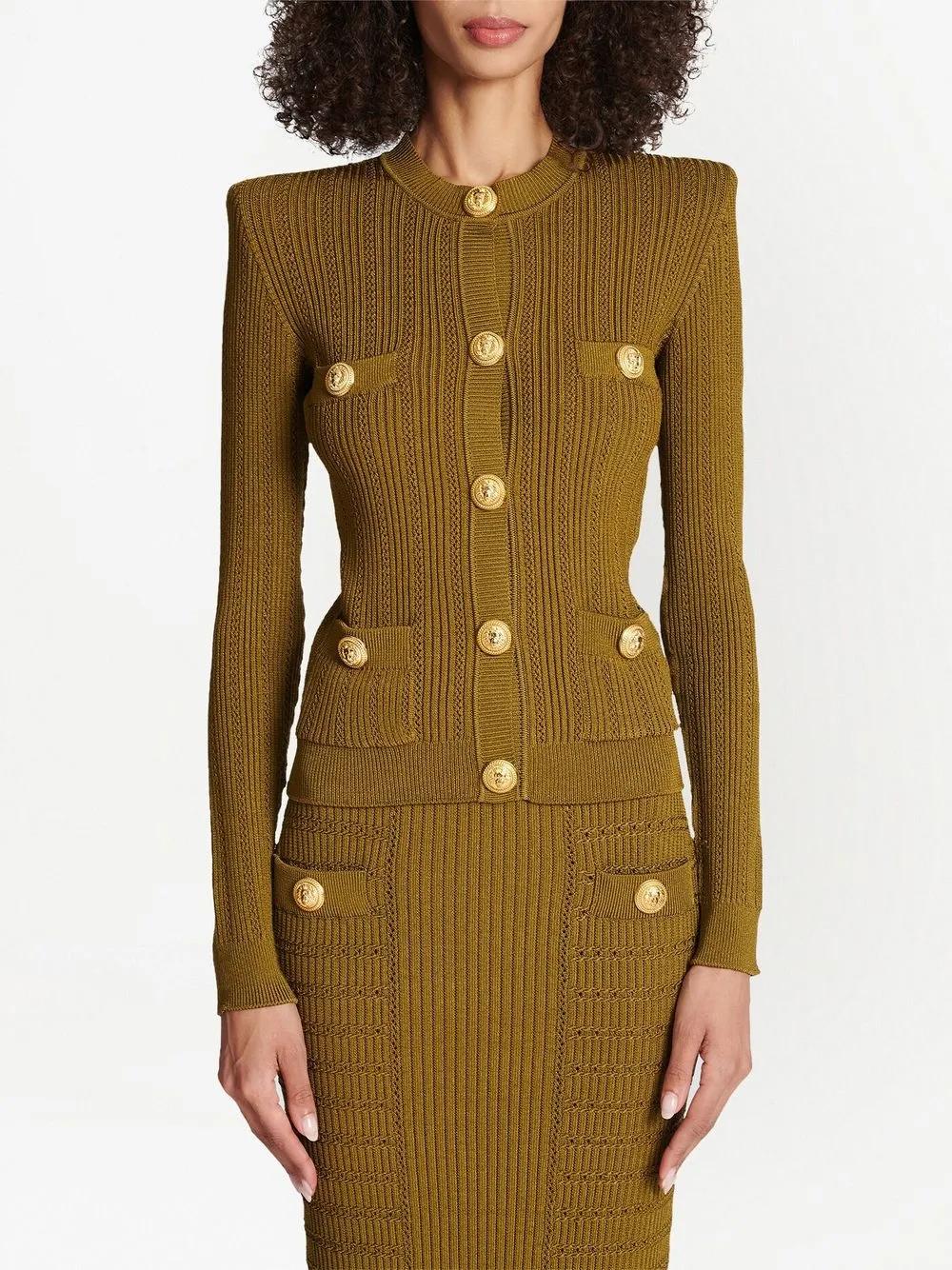 gold-tone knitted construction decorative button detailing ribbed cuffs long sleeves mid-length