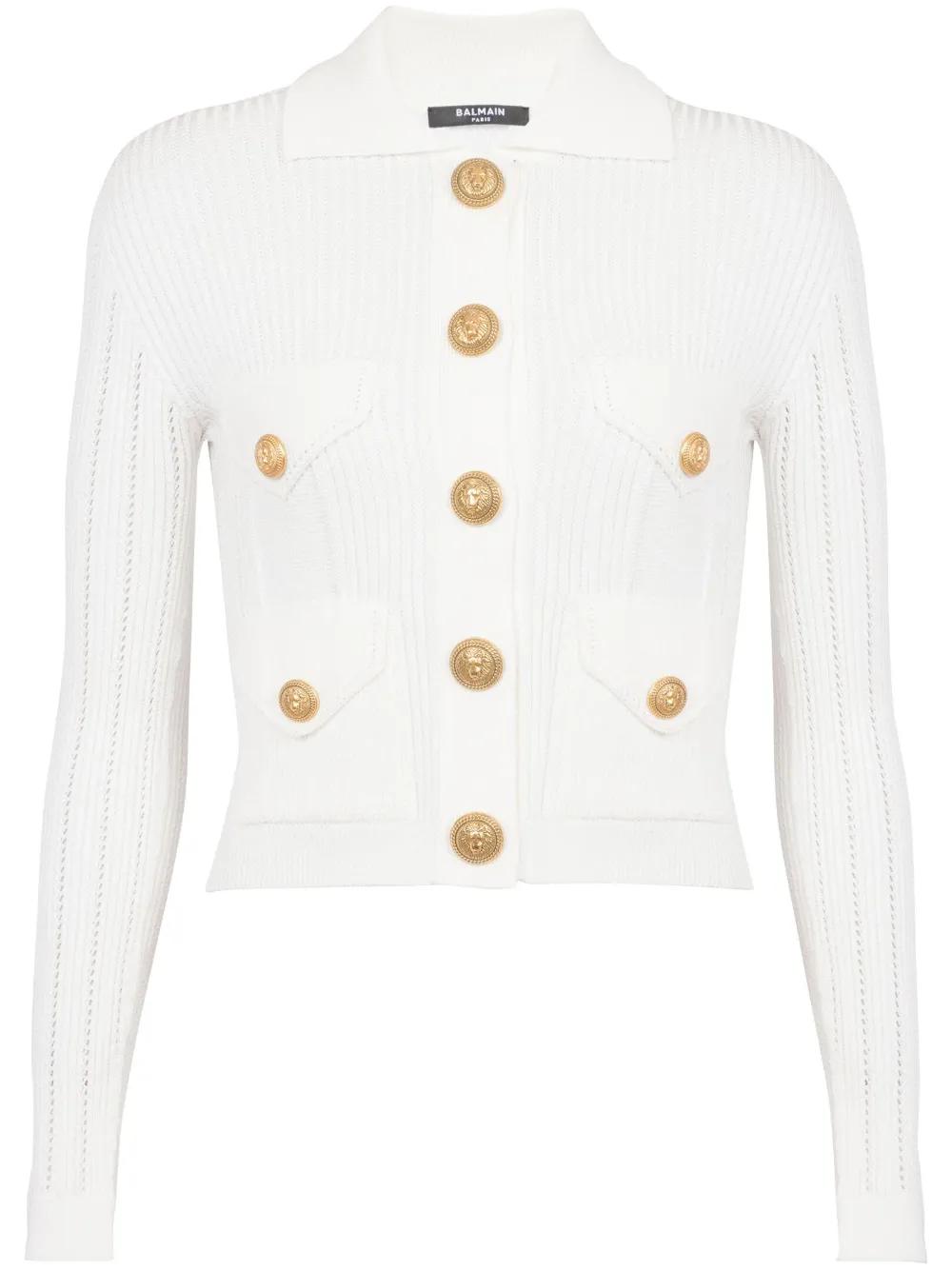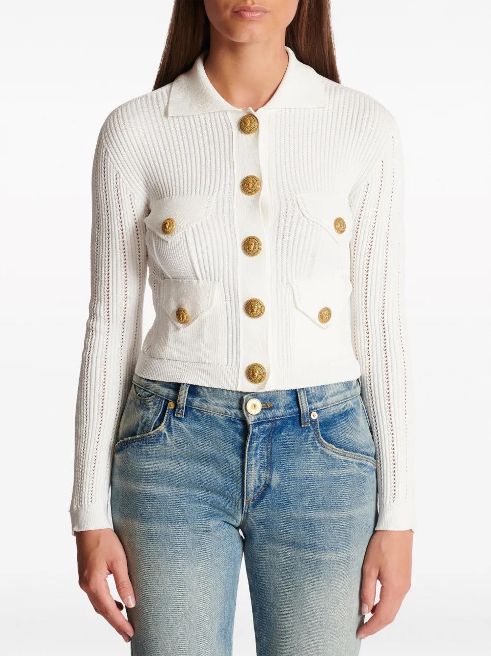 white ribbed knit four front flap pockets front button fastening cut-out detailing spread collar long sleeves straight hem