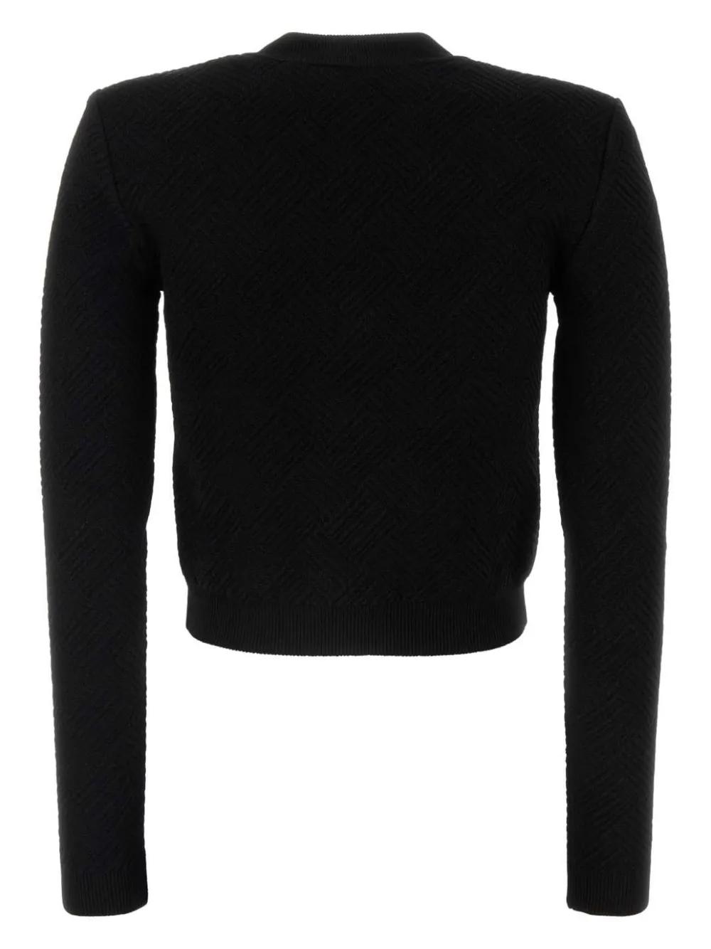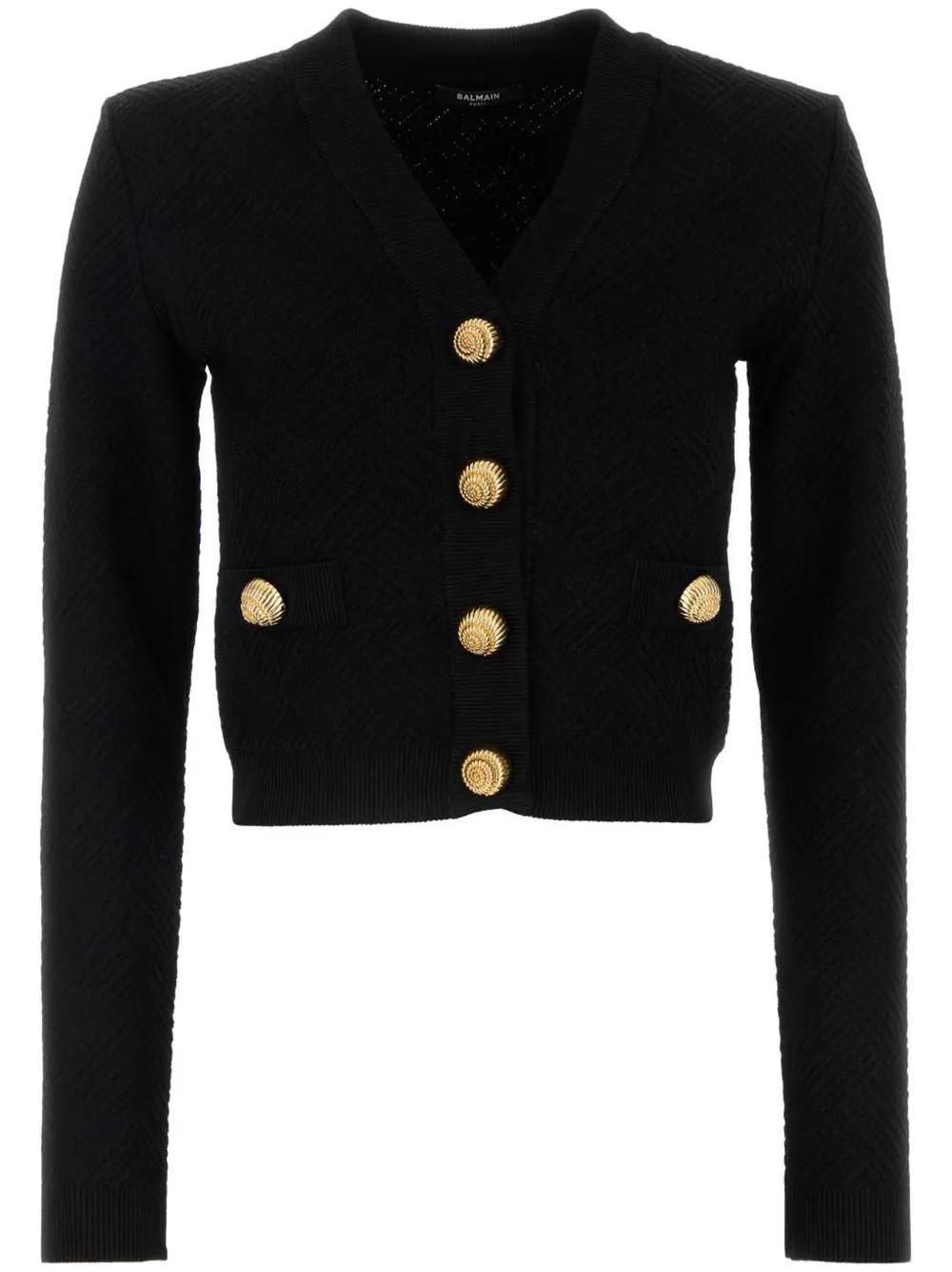 black stretch-design knitted construction V-neck front button fastening long sleeves straight hem
