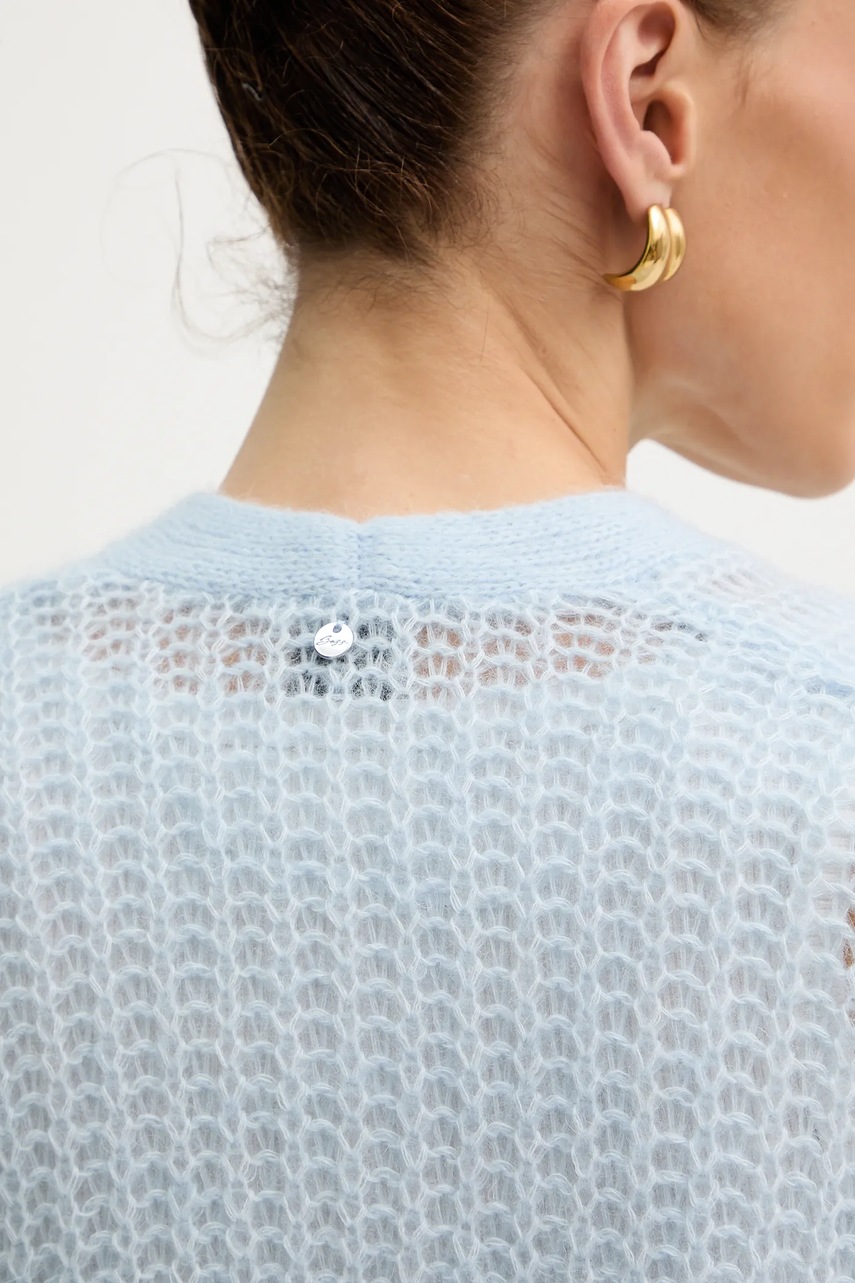 - Luźny krój zapewniający pełną swobodę ruchów. - Obniżona linia ramion. - Długie rękawy wykończone wygodnym, elastycznym ściągaczem. - Efektowny splot. - Niezapinany model. - Długość: 45 cm. - Szerokość pod pachami: 50 cm. - Wymiary podane dla rozmiaru: S.