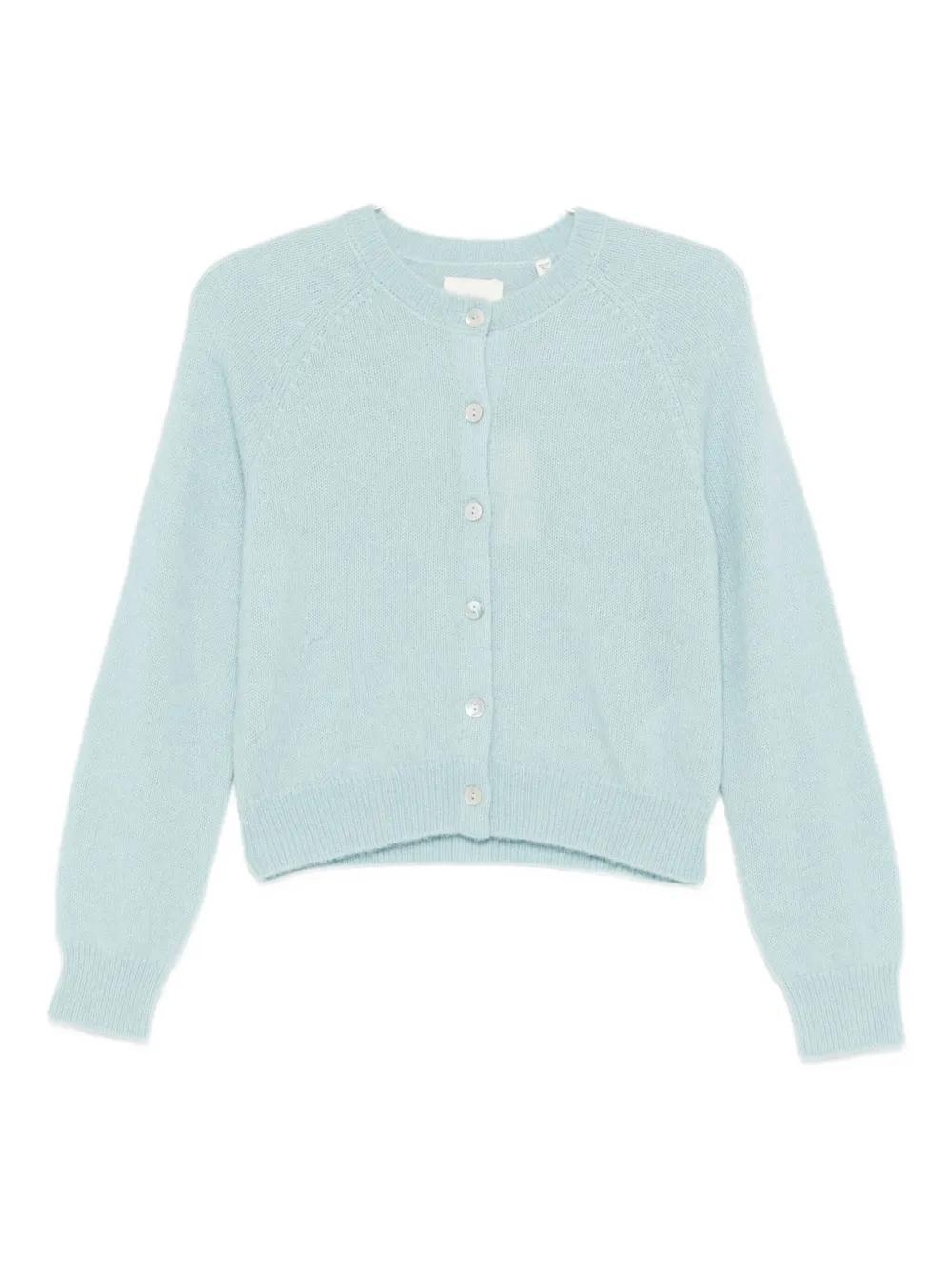 light blue round neck front button fastening long sleeves ribbed hem ribbed cuffs