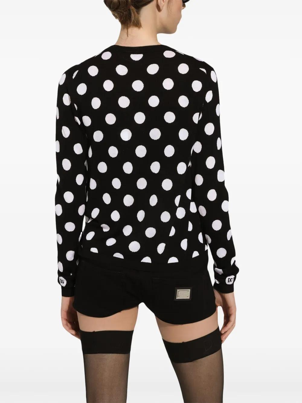 black/white virgin wool-silk blend intarsia knit polka dot print all-over logo print round neck long sleeves front button fastening ribbed edge