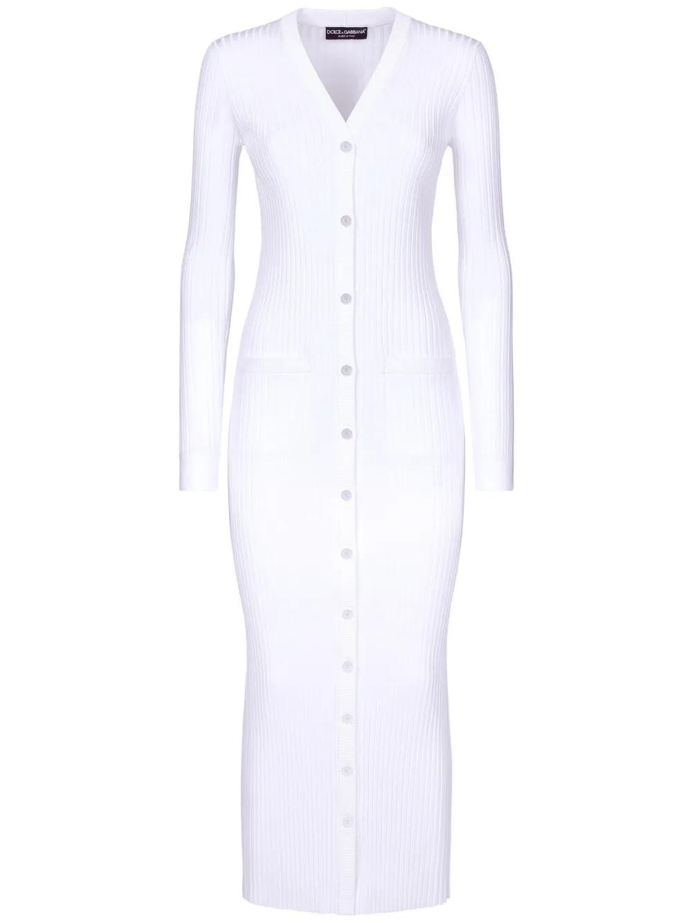 optical white ribbed knit plunging V-neck long sleeves front button fastening straight hem maxi
