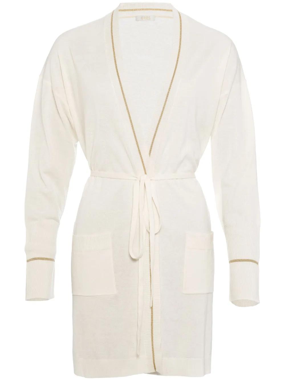 white cashmere fine knit stripe detailing belted waist V-neck two side patch pockets long sleeves ribbed cuffs straight hem