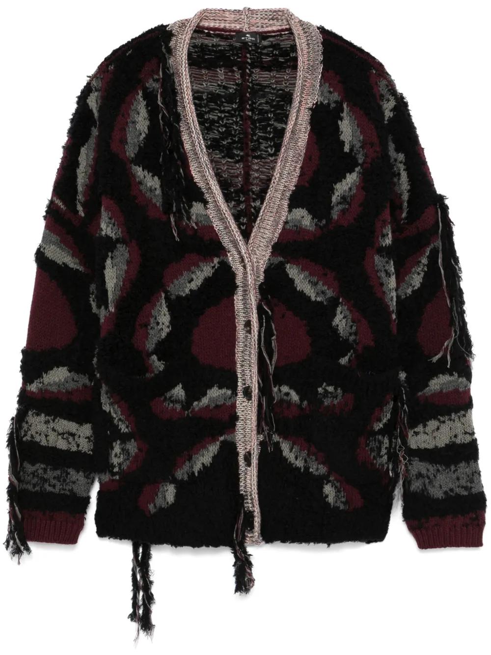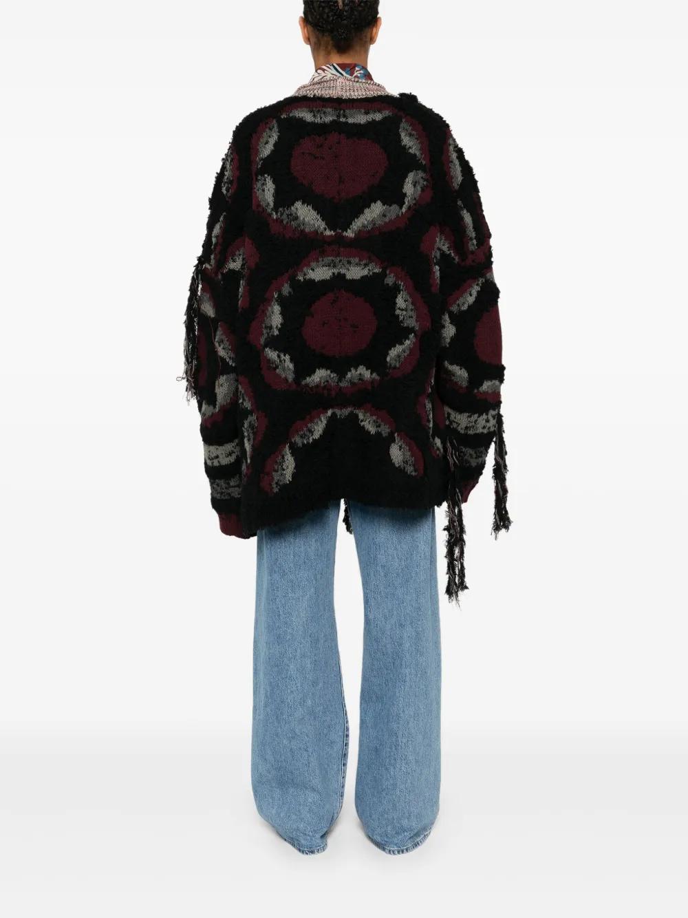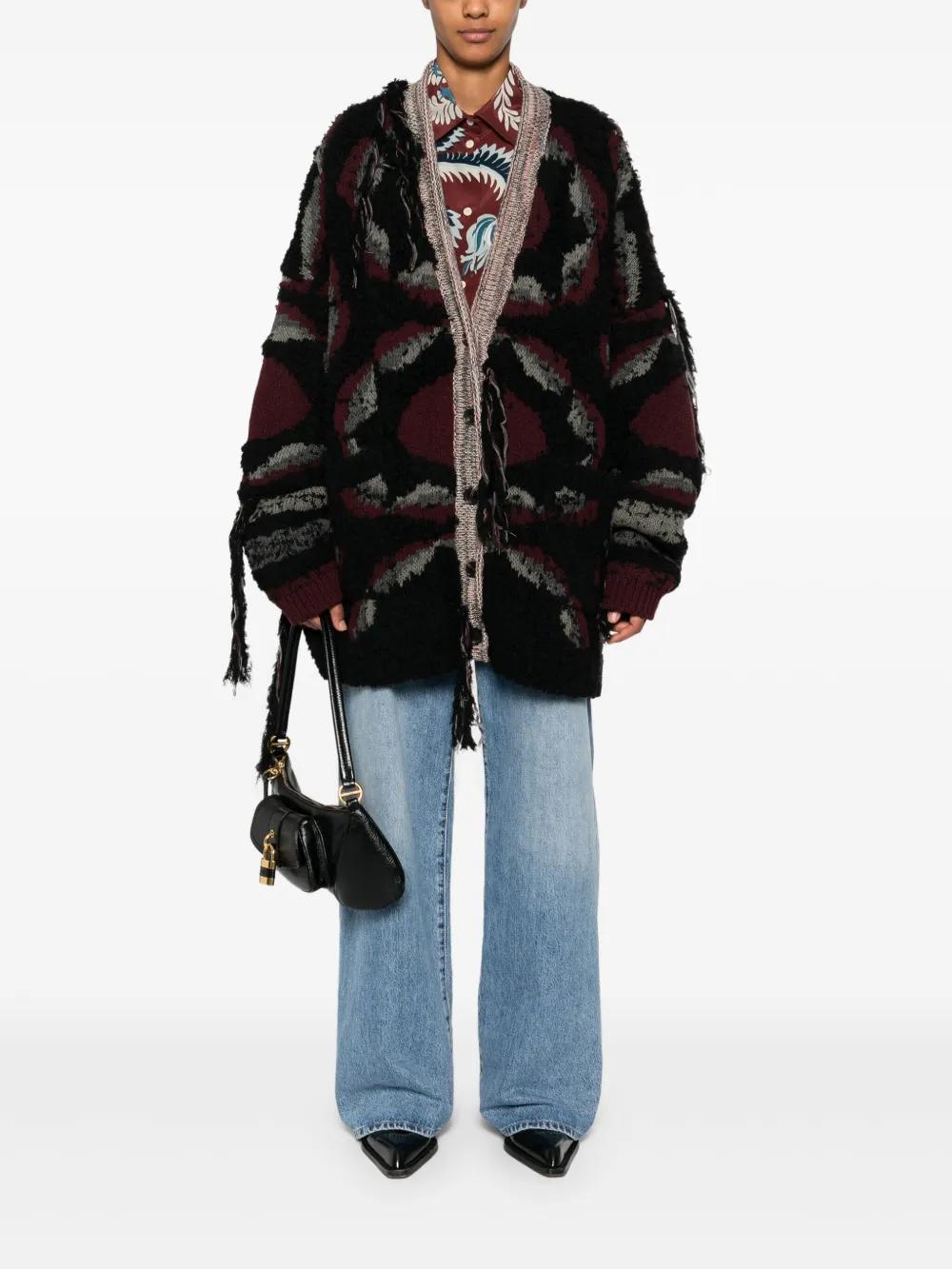 black/multicolour wool blend chunky knit distressed effect front button fastening patterned jacquard V-neck drop shoulder long sleeves ribbed cuffs two side patch pockets straight hem