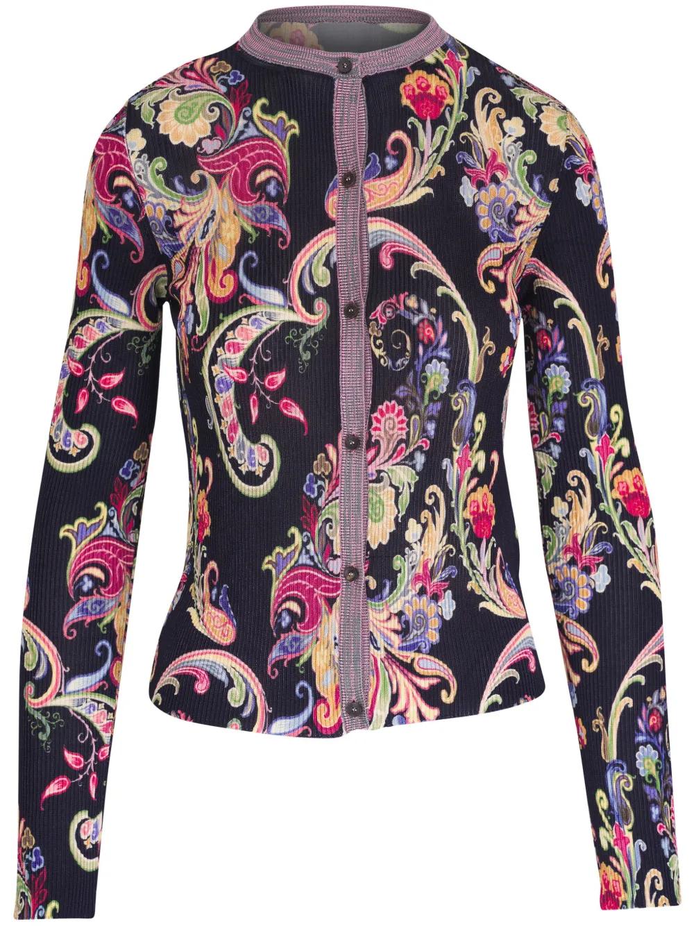 navy blue/multicolour ribbed knit all-over floral print paisley print crew neck front button fastening long sleeves straight hem