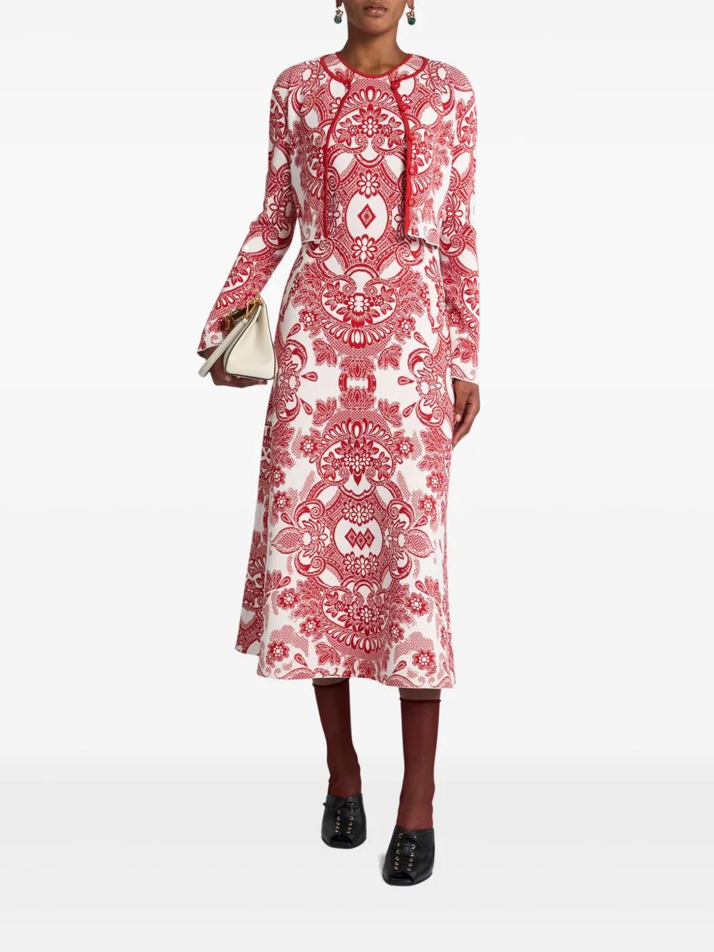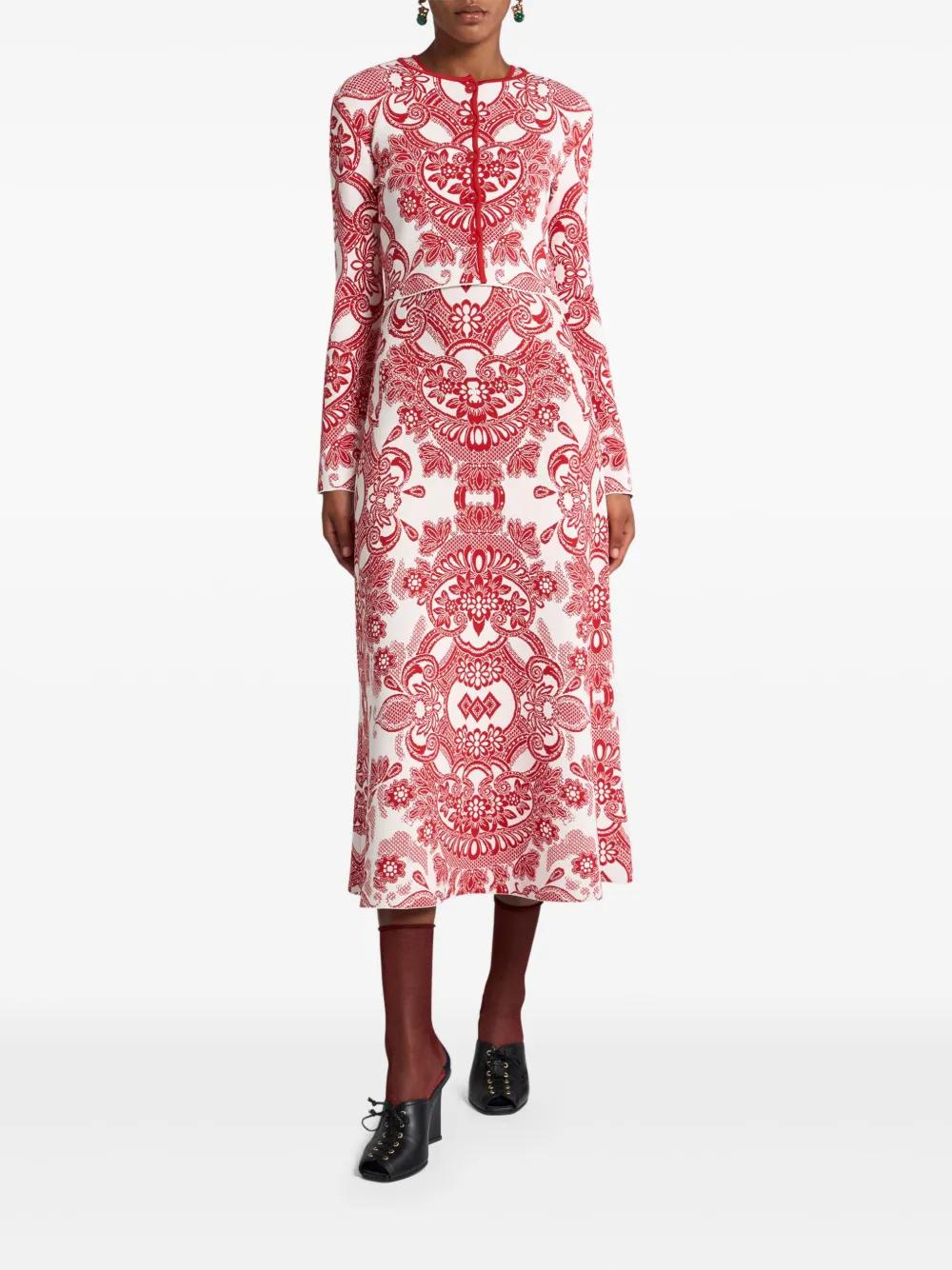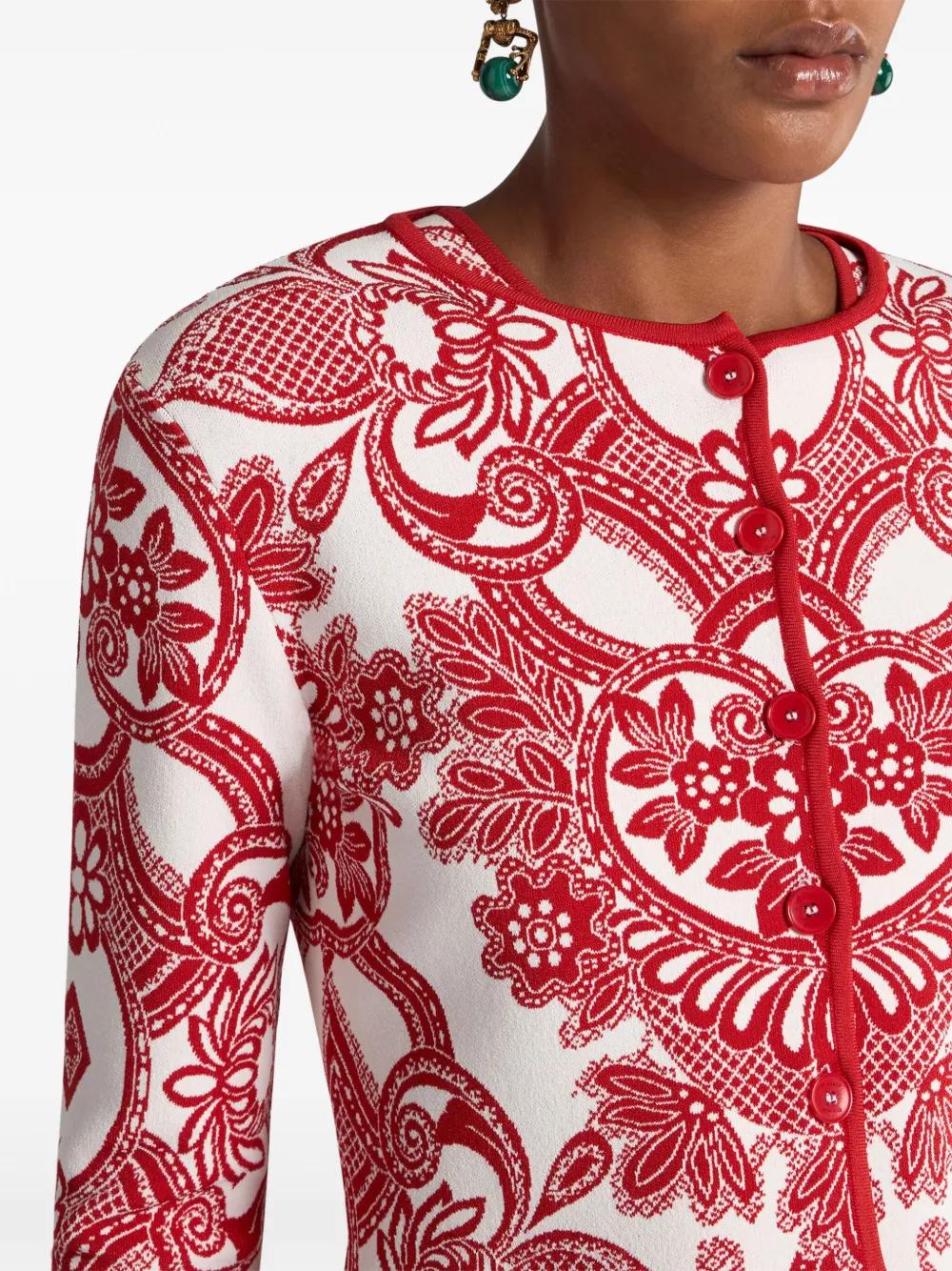 red front button fastening patterned jacquard round neck long sleeves