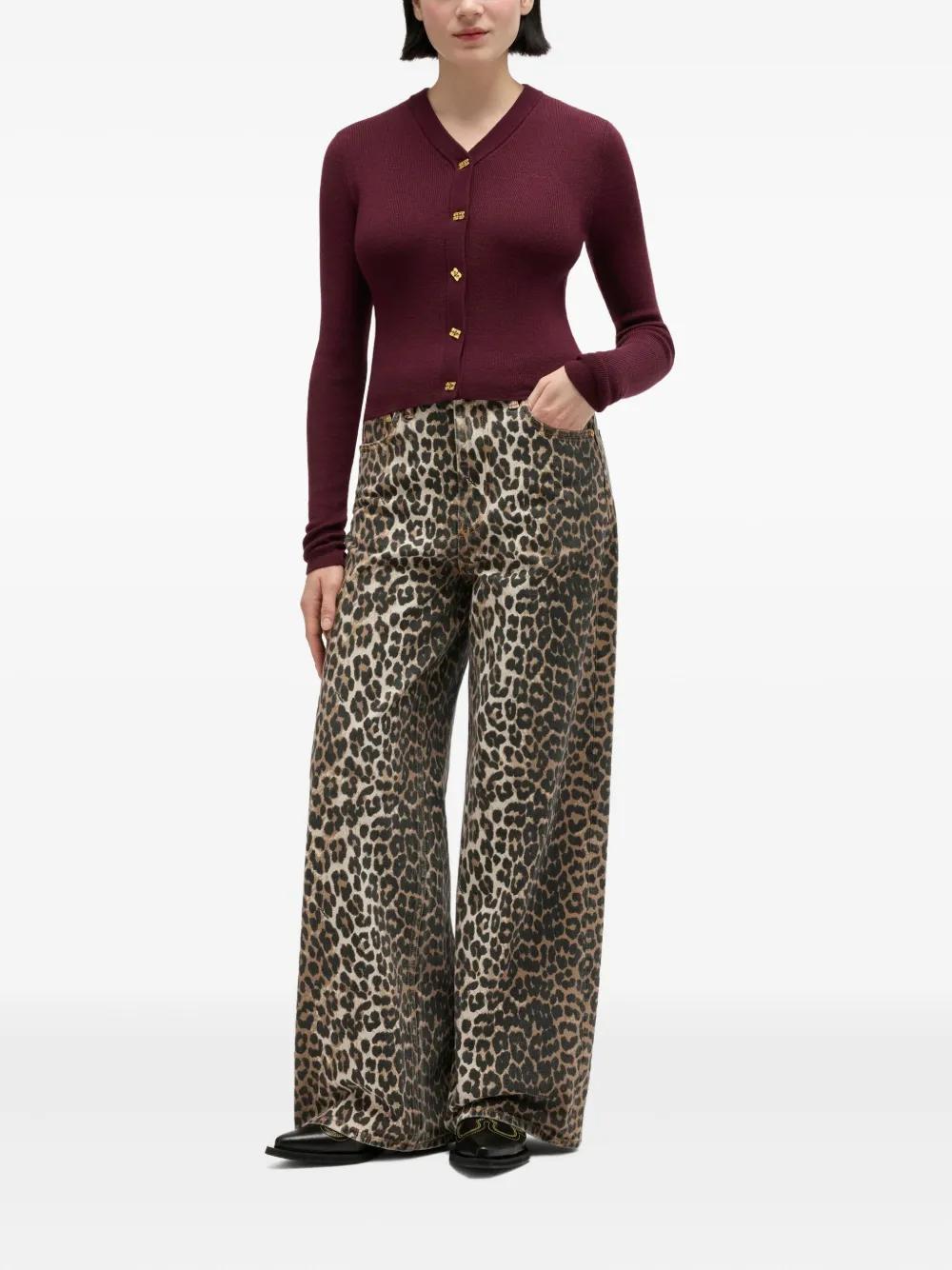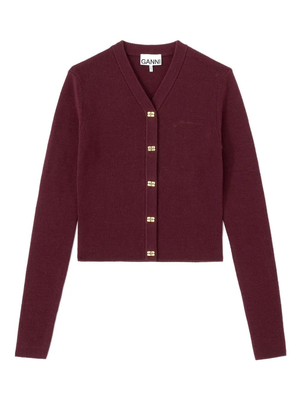 brown patterned intarsia knit front button fastening round neck long sleeves ribbed trim