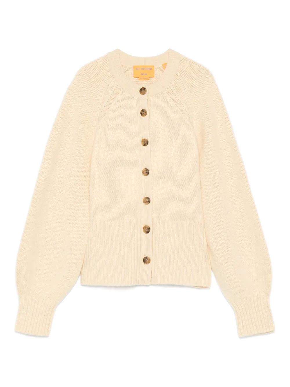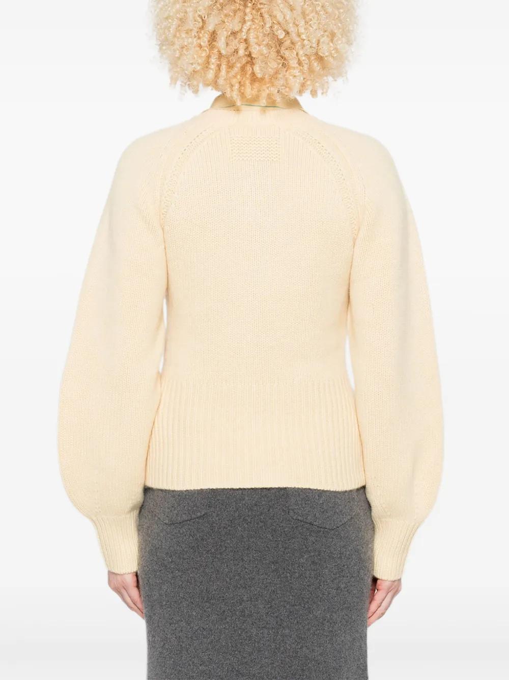 butter beige ribbed knit button fastening raglan balloon sleeves round neck