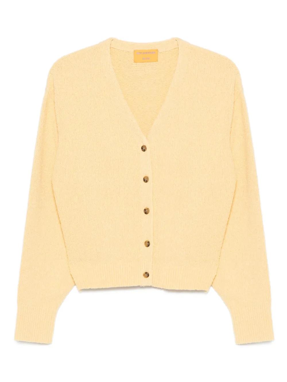 yellow bouclé knit v-neck button fastening side slits hem buttons