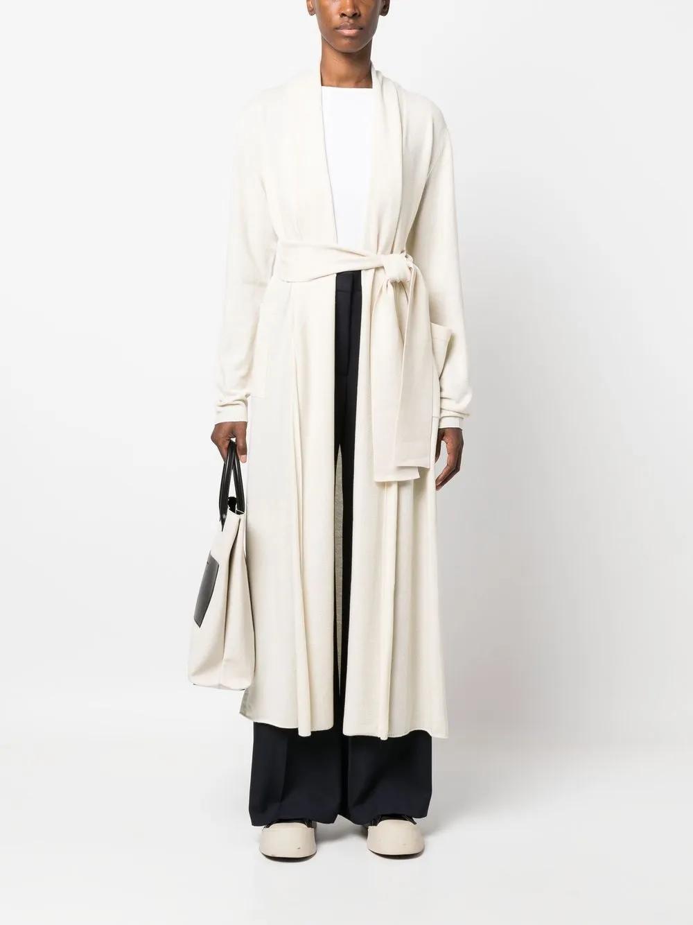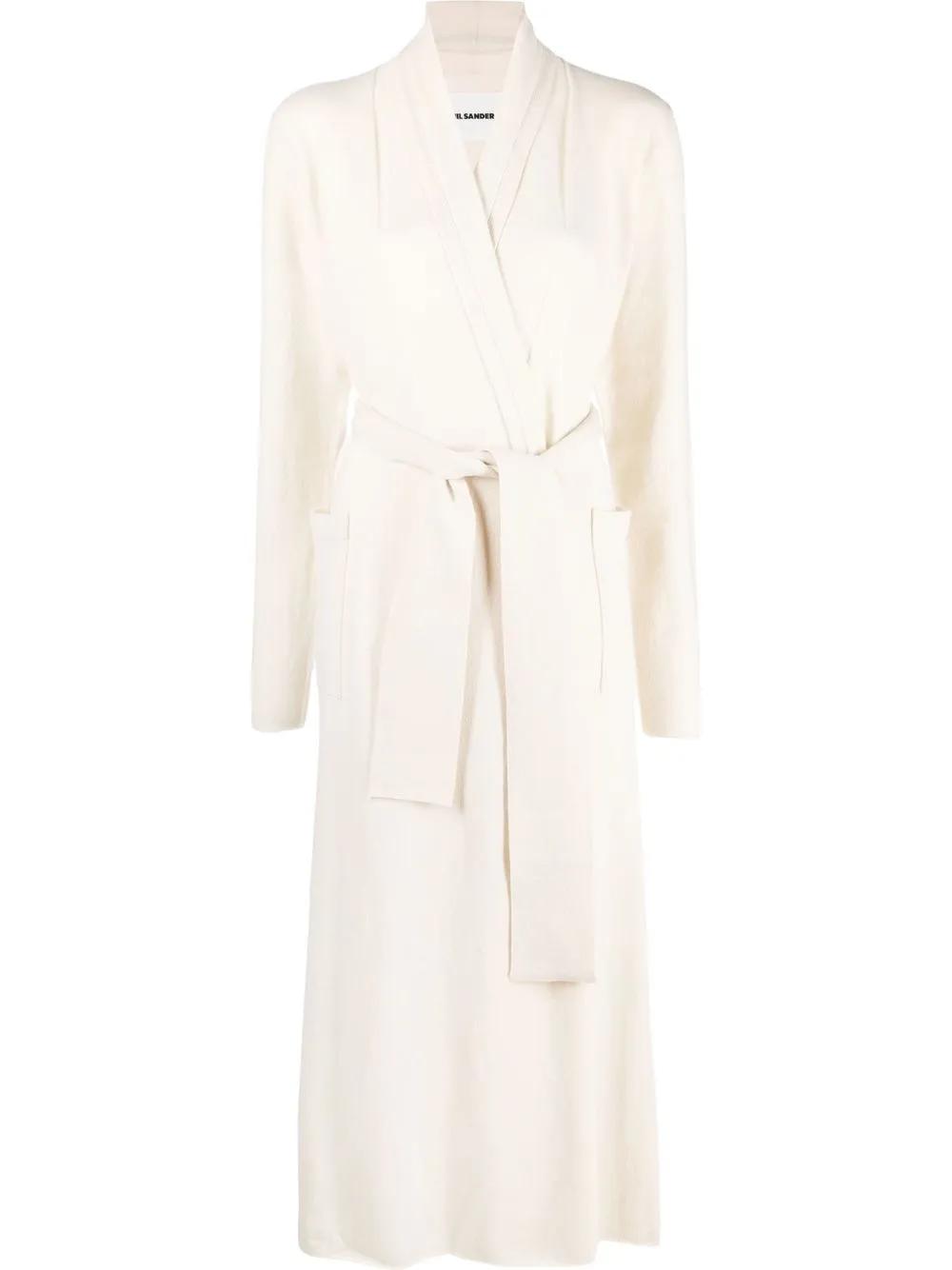 off-white cashmere fine knit shawl lapels long sleeves tied waist two front patch pockets straight hem