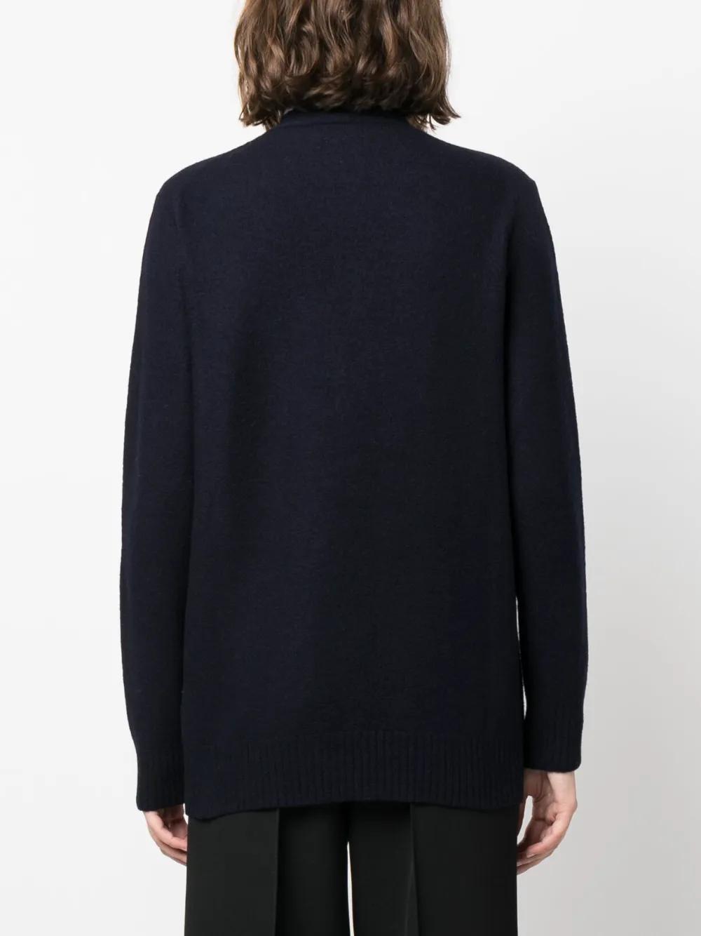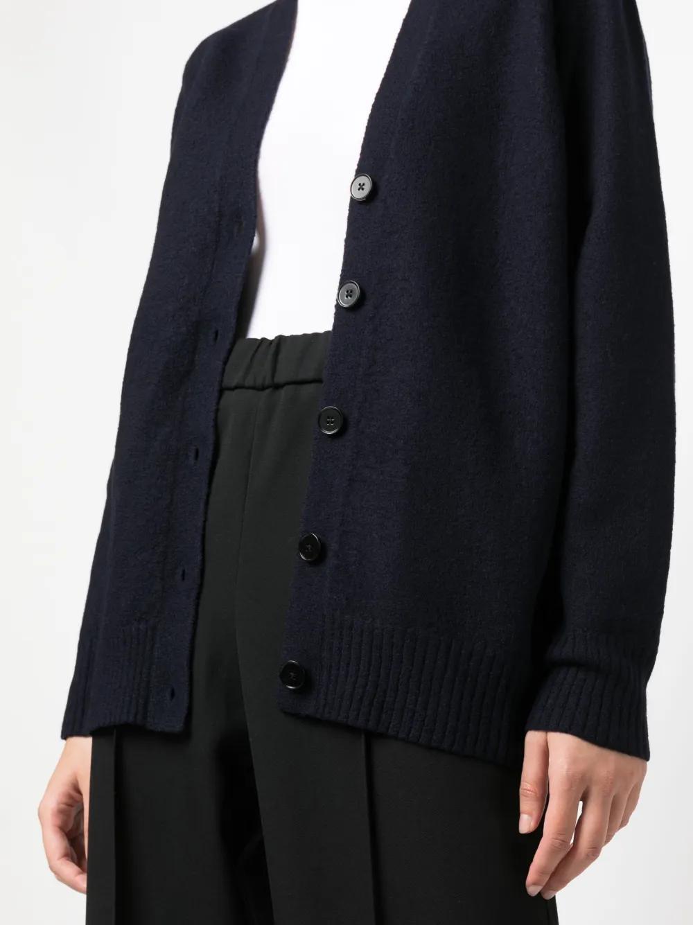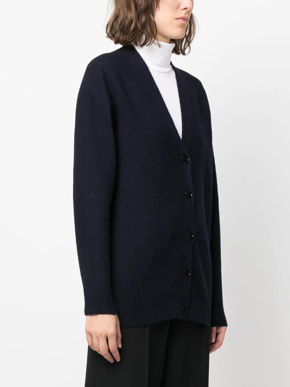 navy blue wool knitted construction V-neck front button fastening long sleeves ribbed cuffs and hem straight hem
