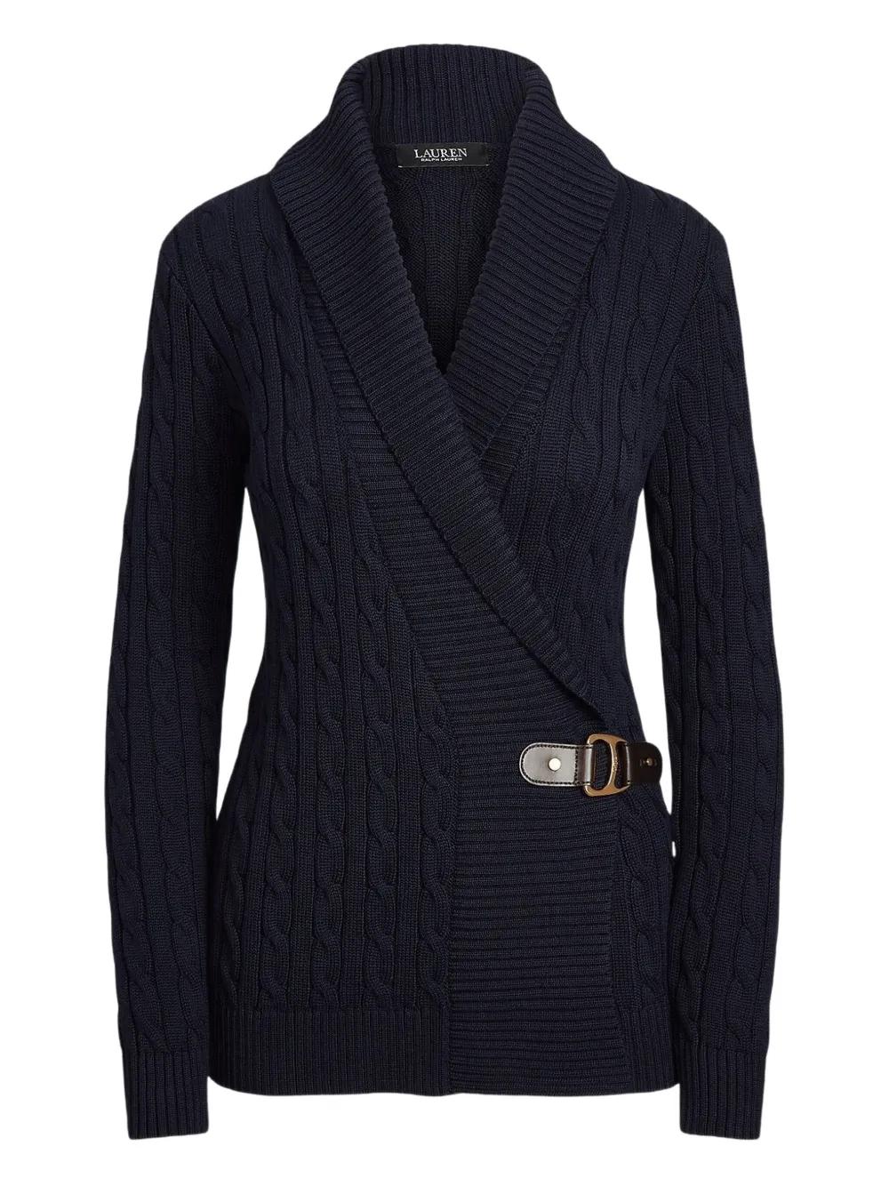 navy blue cable knit shawl lapels long sleeves buckle detail ribbed trims