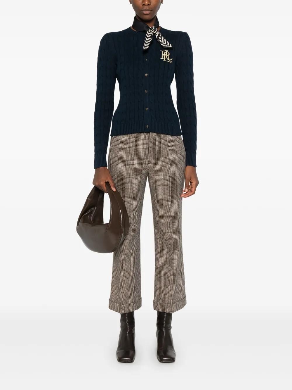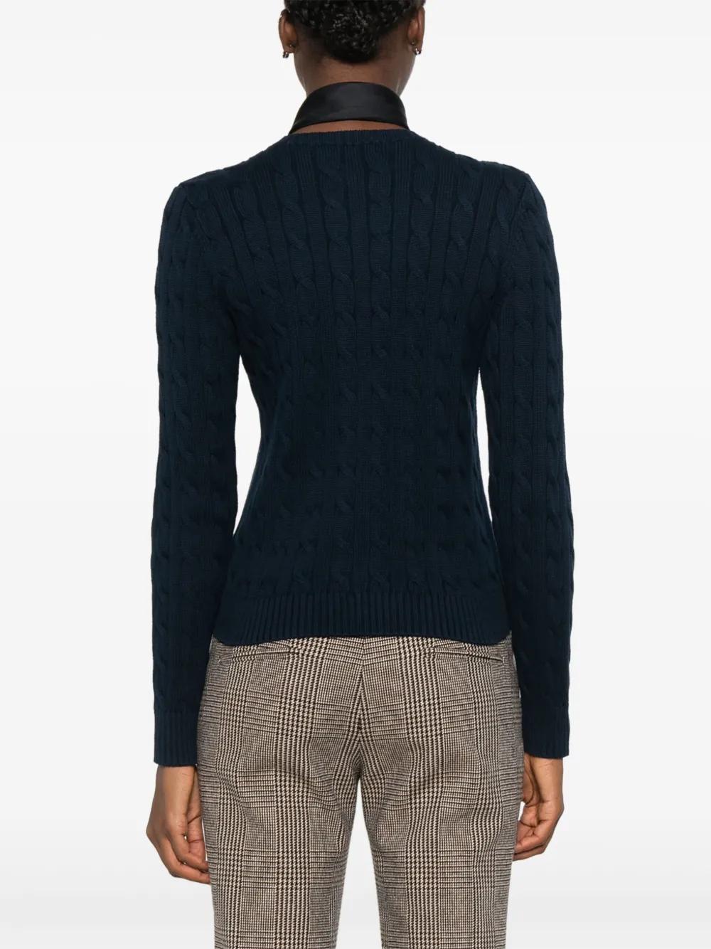 navy blue cotton cable knit front button fastening crew neck long sleeves ribbed cuffs and hem embroidered logo at the chest metallic threading