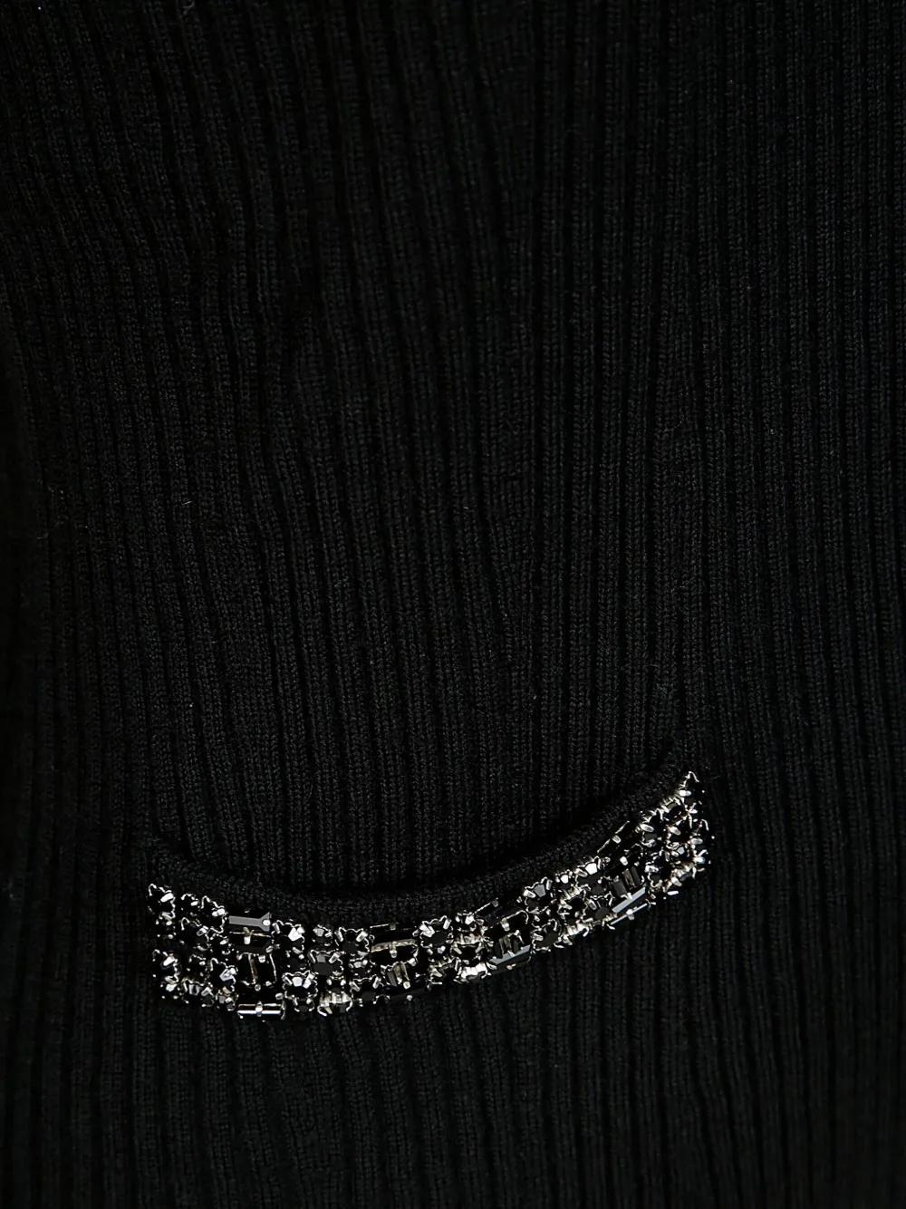 black ribbed knit jewel embellishment V-neck button fastening long sleeves