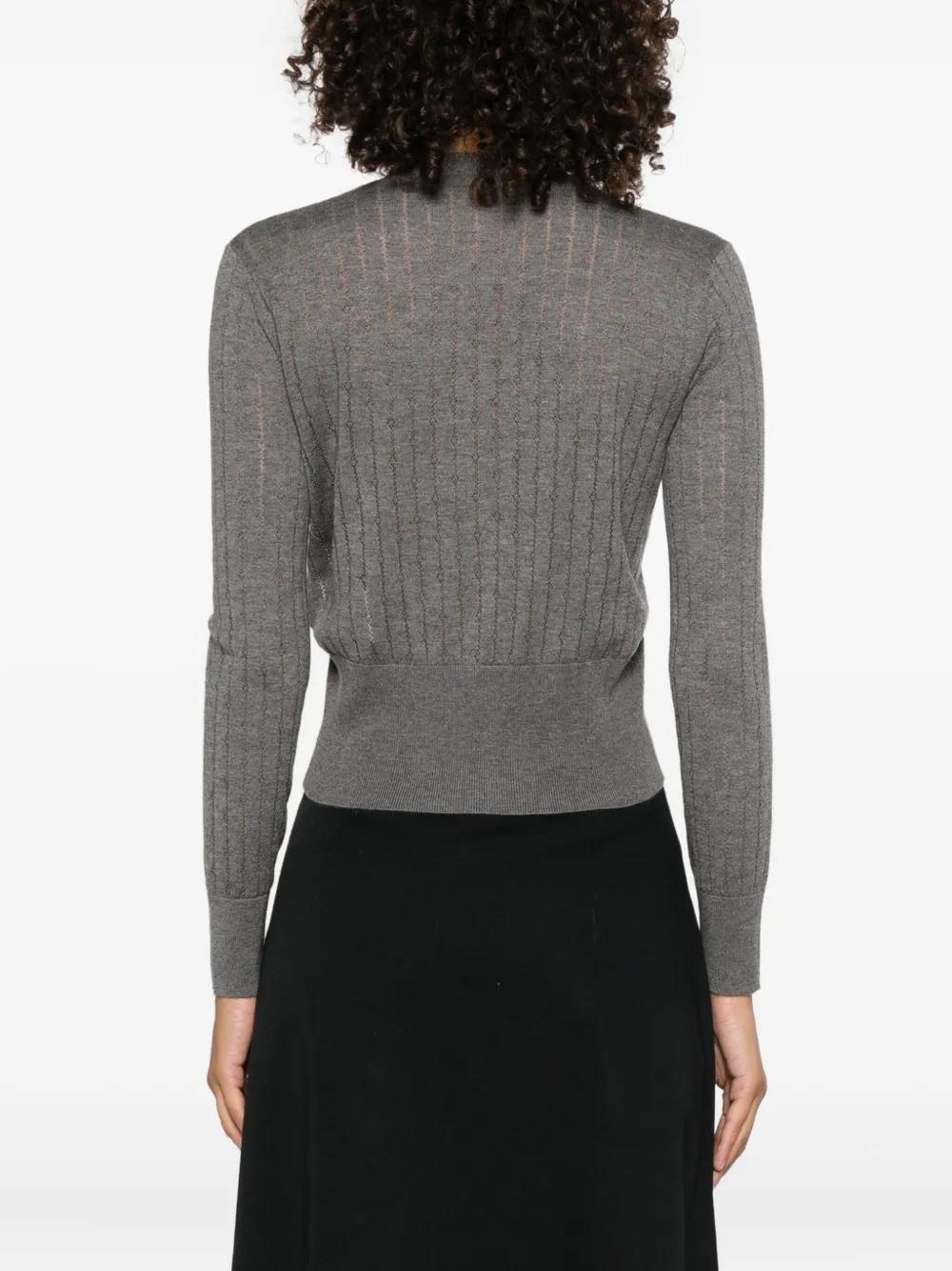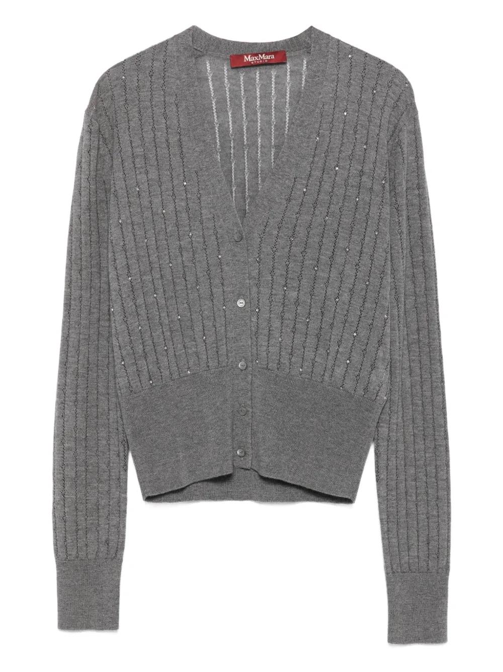 grey V-neck front button closure ribbed trim embellished detailing silk-wool blend
