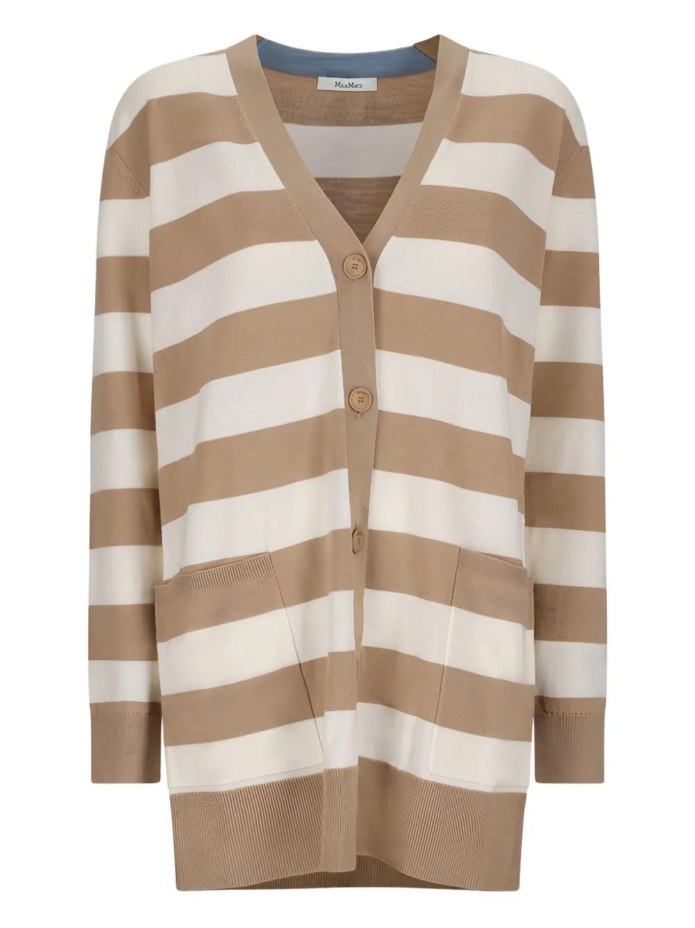 beige horizontal stripes button front 1951 embroidery V-neck patch pockets