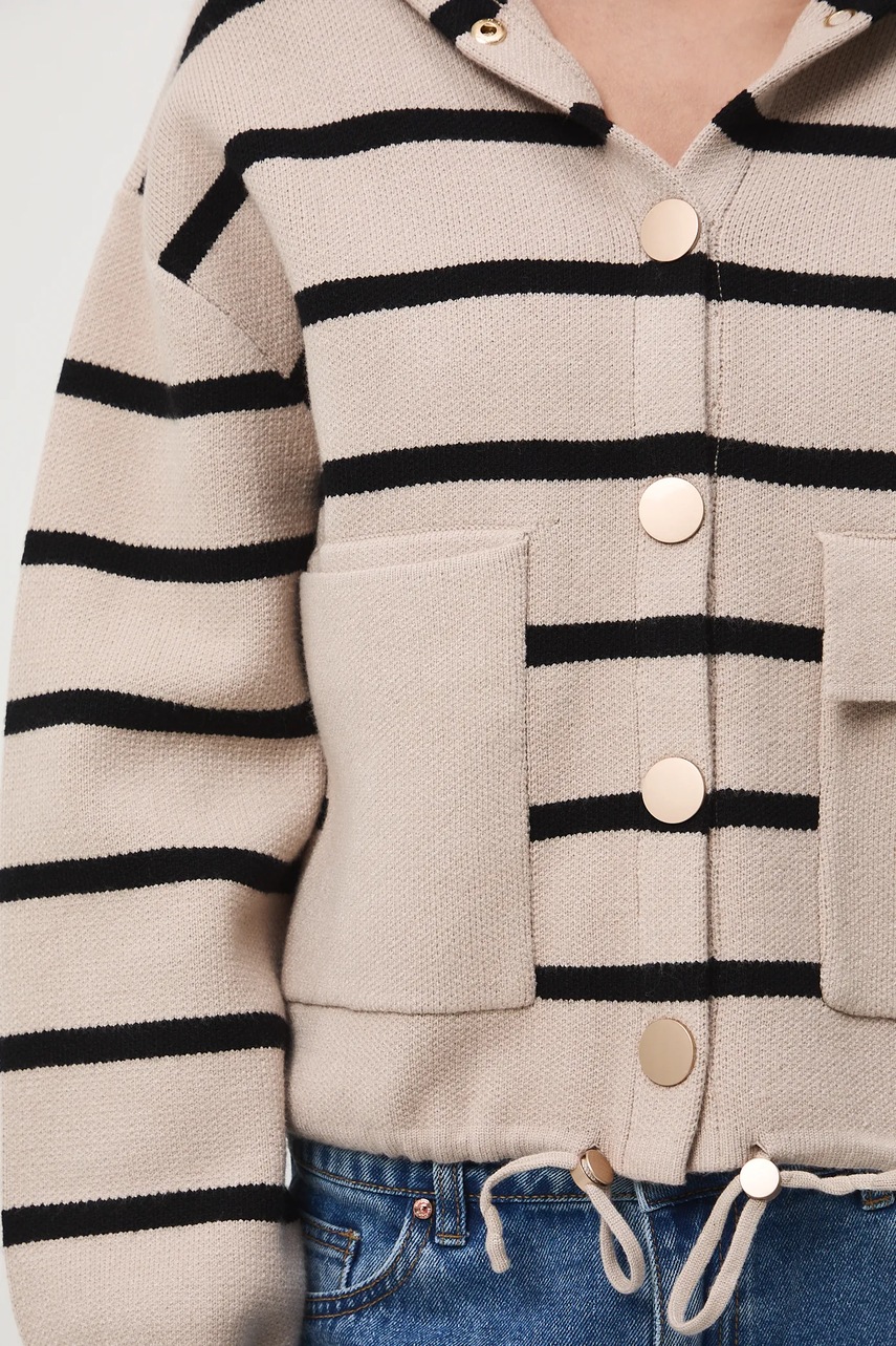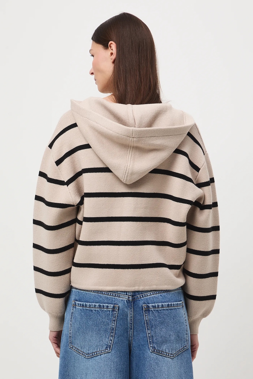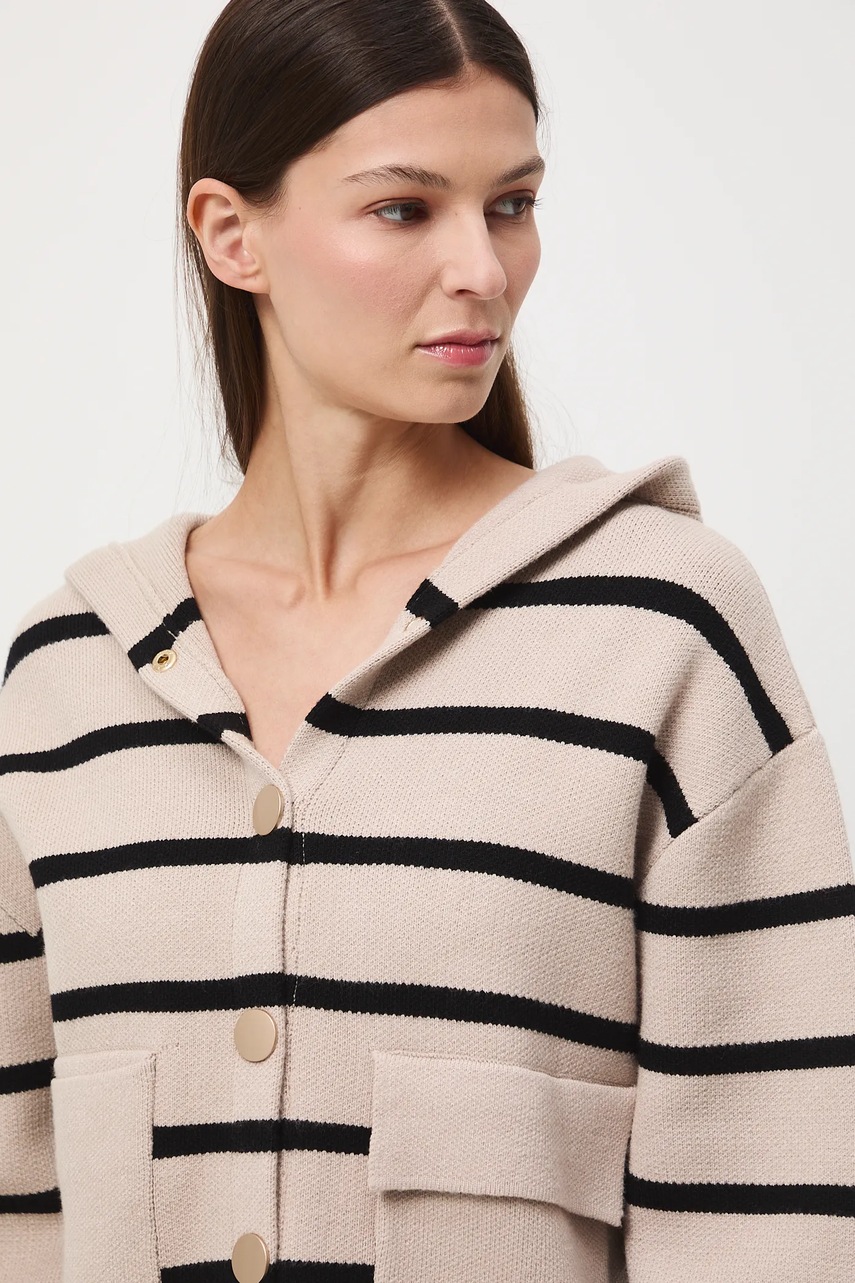 - Fason oversize. - Długi rękaw. - Obniżona linia ramion. - Rękawy wykończone ściągaczem. - Model z kapturem. - Zapięcie na zatrzaski. - Z przodu dwie kieszonki z patkami. - Dolna krawędź wykończona troczkami ze stoperami, które zapewniają indywidualne dopasowanie. - Gładka dzianina. - Długość rękawa(mierzona od kaptura): 73 cm. - Wzorzysta dzianina. - Wzór w pasy. - Długość: 56,5 cm. - Szerokość w biuście: 59 cm. - Wymiary podane dla rozmiaru: S.
