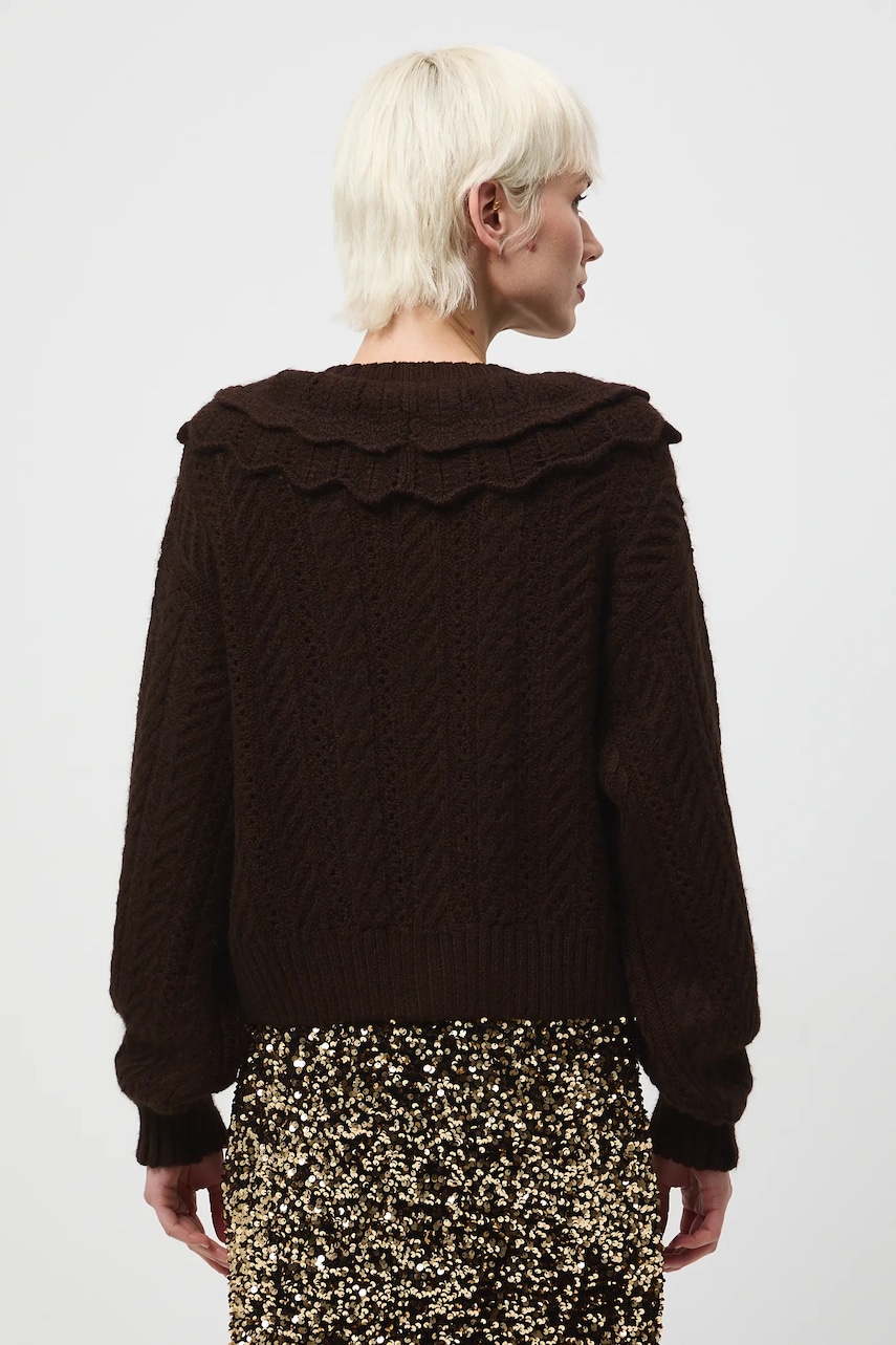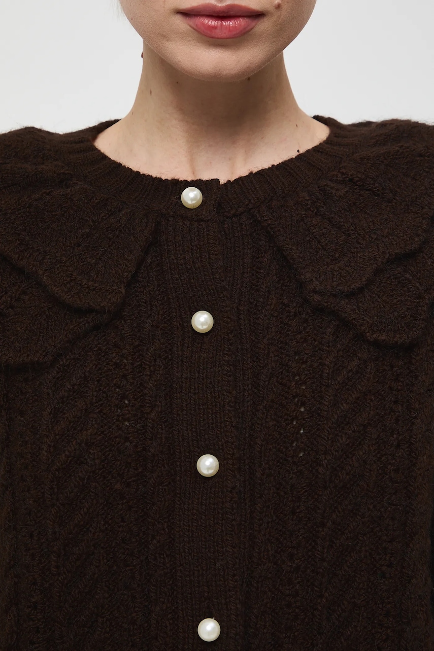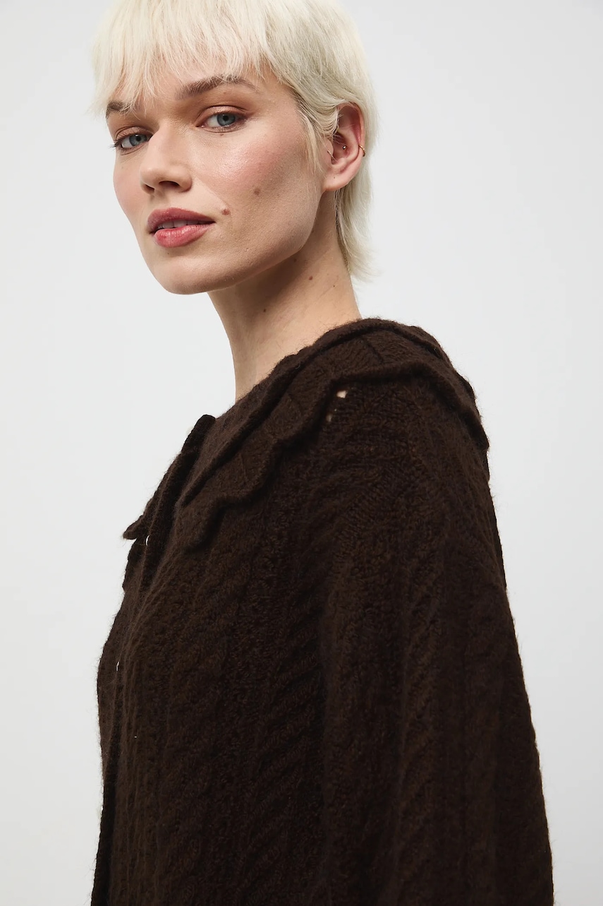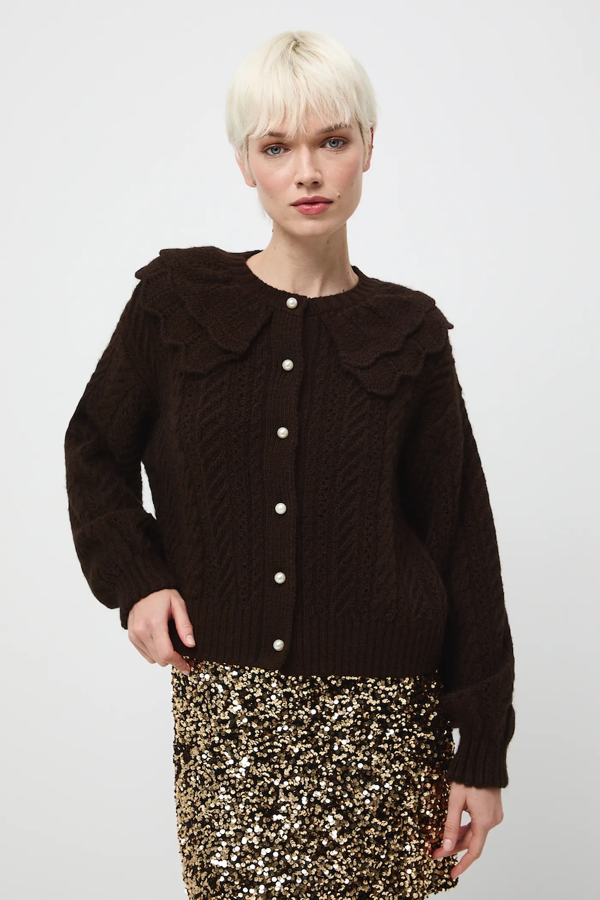 - Kardigan w fasonie regular zapewnia wygodę i uniwersalny wygląd. Delikatnie dopasowuje się do sylwetki, ale nie podkreśla jej nadmiernie. Klasyczny i prosty, sprawdzi się zarówno w eleganckich, jak i casualowych stylizacjach. - Długi rękaw. - Obniżona linia ramion. - Okrągły dekolt. - Model z ozdobnym kołnierzem. - Zapięcie na ozdobne guziki. - Wykończenie ze ściągacza. - Warkoczowy splot. - Długość rękawa(mierzona od dekoltu): 73 cm. - Długość: 53 cm. - Szerokość w biuście: 53 cm. - Wymiary podane dla rozmiaru: S.