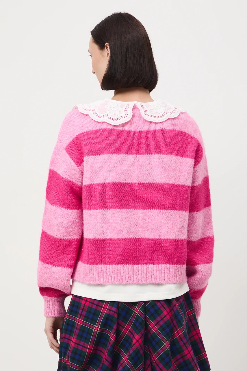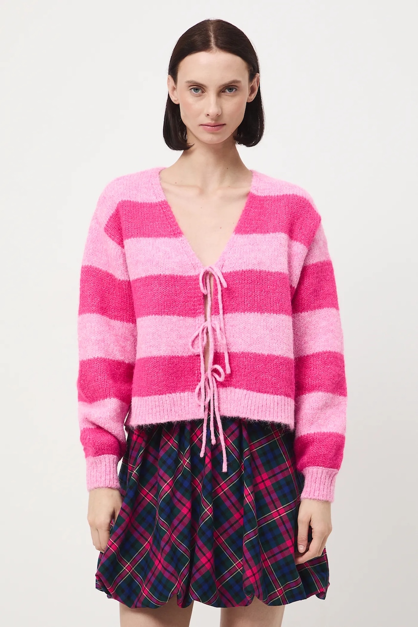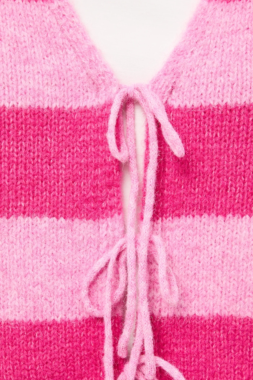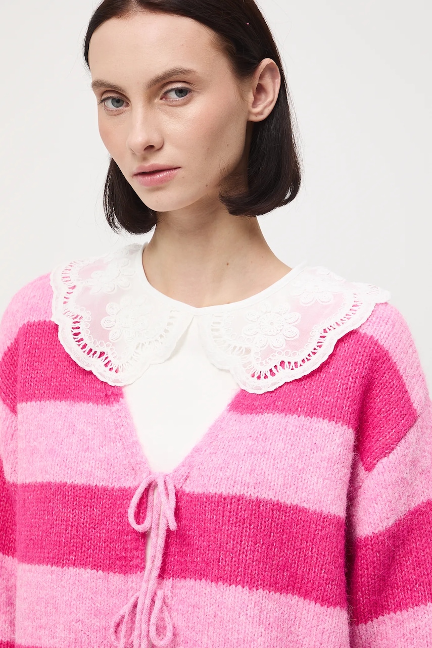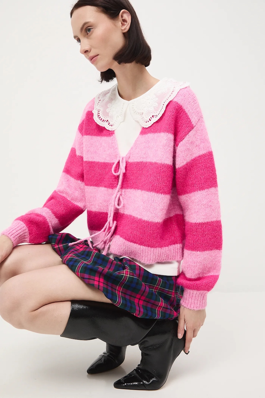 - Kardigan w fasonie regular zapewnia wygodę i uniwersalny wygląd. Delikatnie dopasowuje się do sylwetki, ale nie podkreśla jej nadmiernie. Klasyczny i prosty, sprawdzi się zarówno w eleganckich, jak i casualowych stylizacjach. - Długi rękaw. - Obniżona linia ramion. - Spiczasty dekolt. - Model z wiązaniem. - Wykończenie ze ściągacza. - Wzorzysta dzianina. - Wzór w pasy. - Długość rękawa(mierzona od dekoltu): 71,3 cm. - Długość: 53 cm. - Szerokość w biuście: 53 cm. - Wymiary podane dla rozmiaru: S.