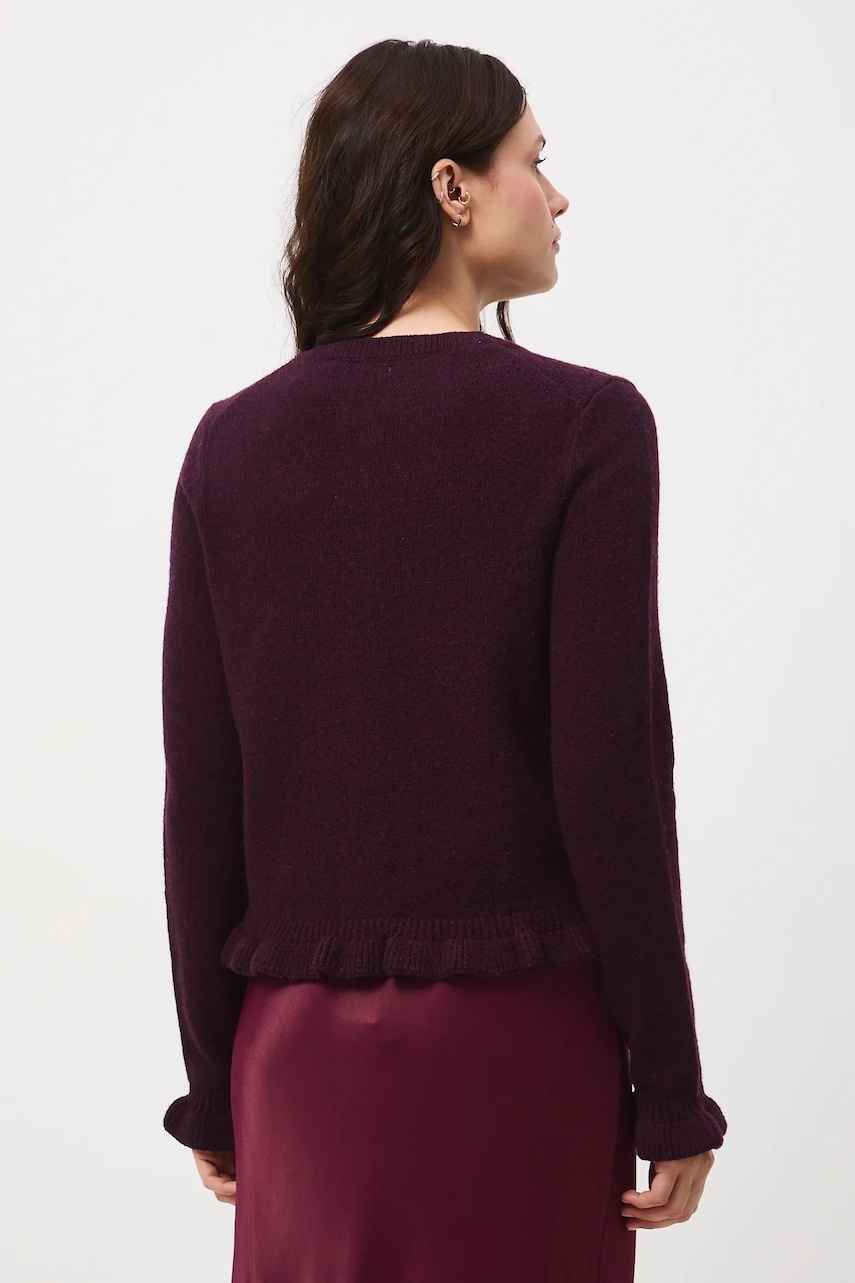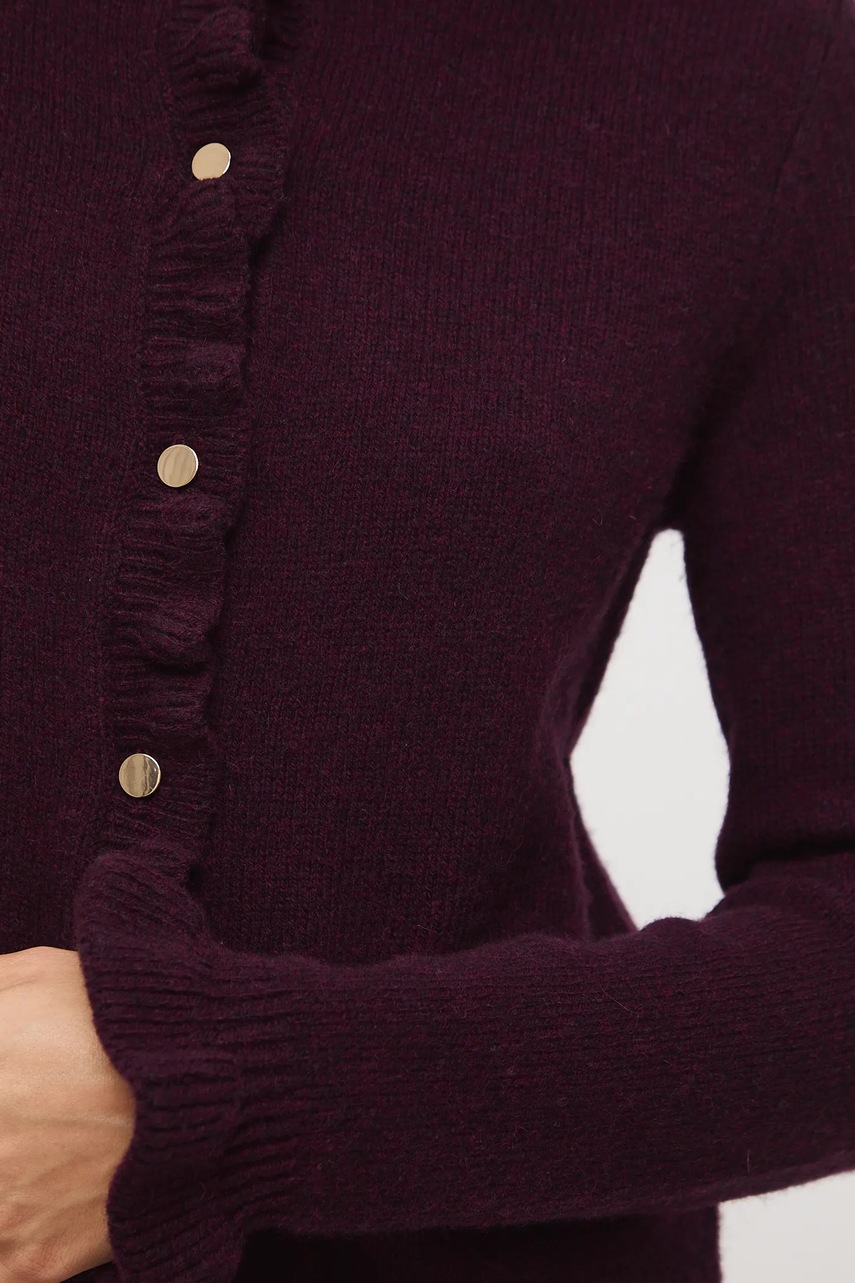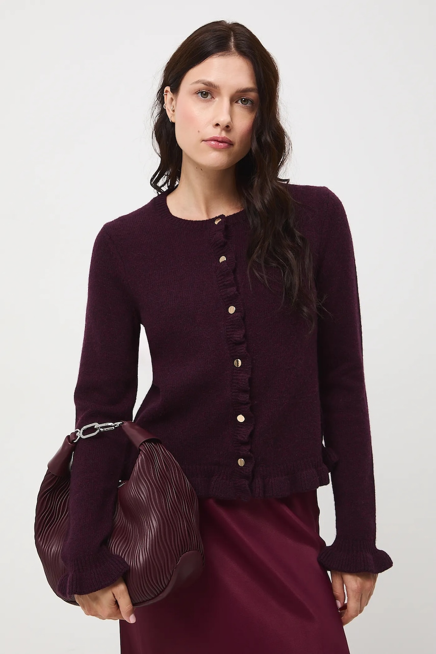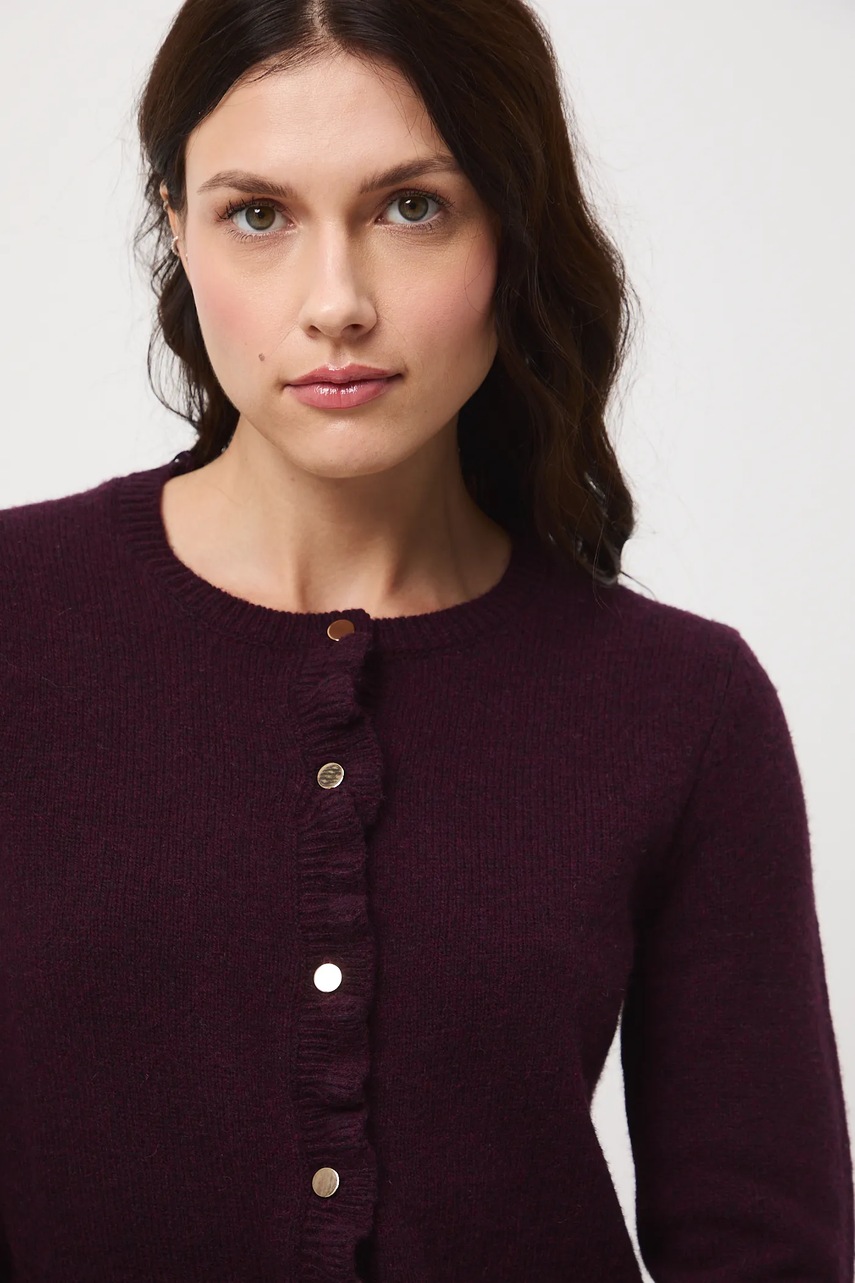 - Model wykonany w 50% z wełny. - Kardigan w fasonie regular zapewnia wygodę i uniwersalny wygląd. Delikatnie dopasowuje się do sylwetki, ale nie podkreśla jej nadmiernie. Klasyczny i prosty, sprawdzi się zarówno w eleganckich, jak i casualowych stylizacjach. - Długi rękaw. - Okrągły dekolt. - Zapięcie na guziki. - Model z ozdobną falbaną. - Gładka dzianina. - Długość rękawa: 61 cm. - Długość: 55 cm. - Szerokość w biuście: 46 cm. - Wymiary podane dla rozmiaru: S.