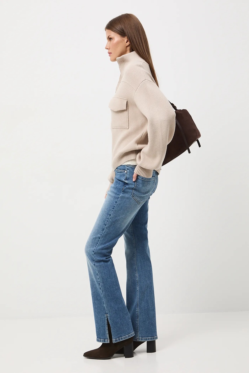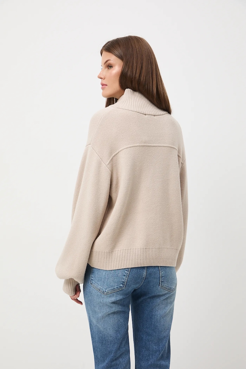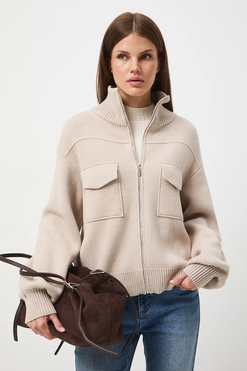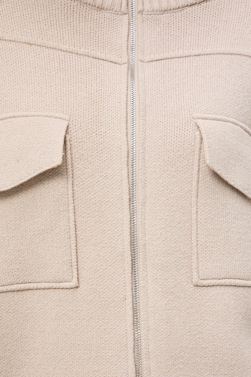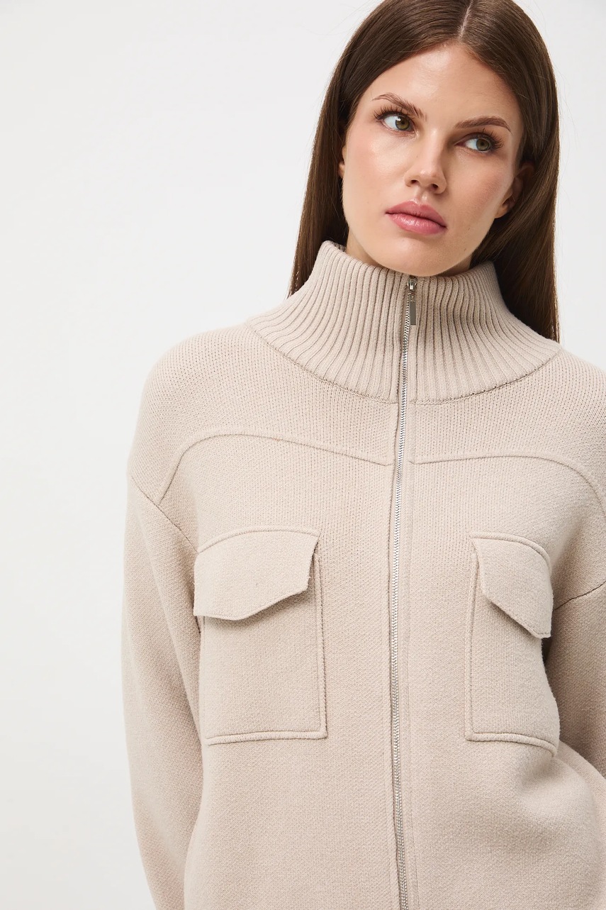 - Fason regular. - Długi rękaw. - Obniżona linia ramion. - Model z półgolfem. - Zapięcie na suwak. - Kieszonki na piersi. - Wykończenie ze ściągacza. - Gładka dzianina. - Długość rękawa(mierzona od kołnierza): 72,1 cm. - Długość: 57 cm. - Szerokość w biuście: 56,5 cm. - Wymiary podane dla rozmiaru: S.
