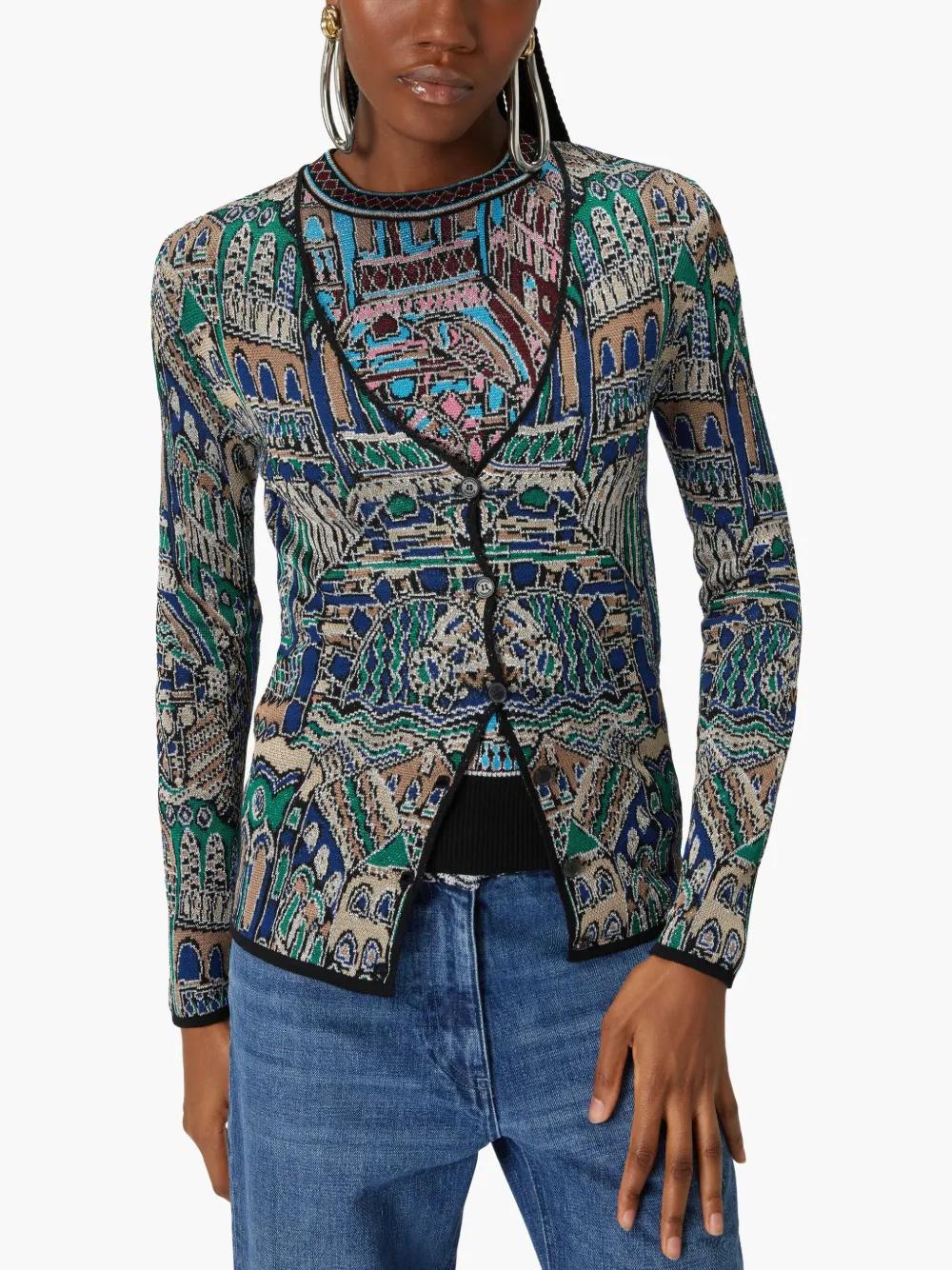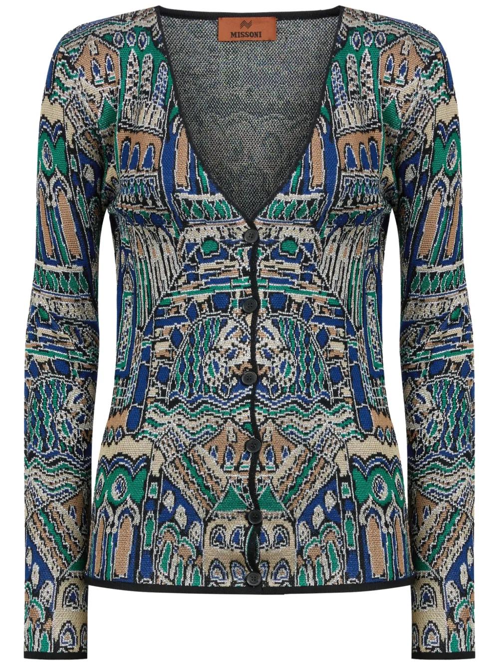 emerald green wool blend metallic finish abstract pattern print knitted construction contrasting trim V-neck front button fastening long sleeves The item you receive may differ slightly from the item photographed. This is due to the artisanal nature with which all Missoni products are constructed.