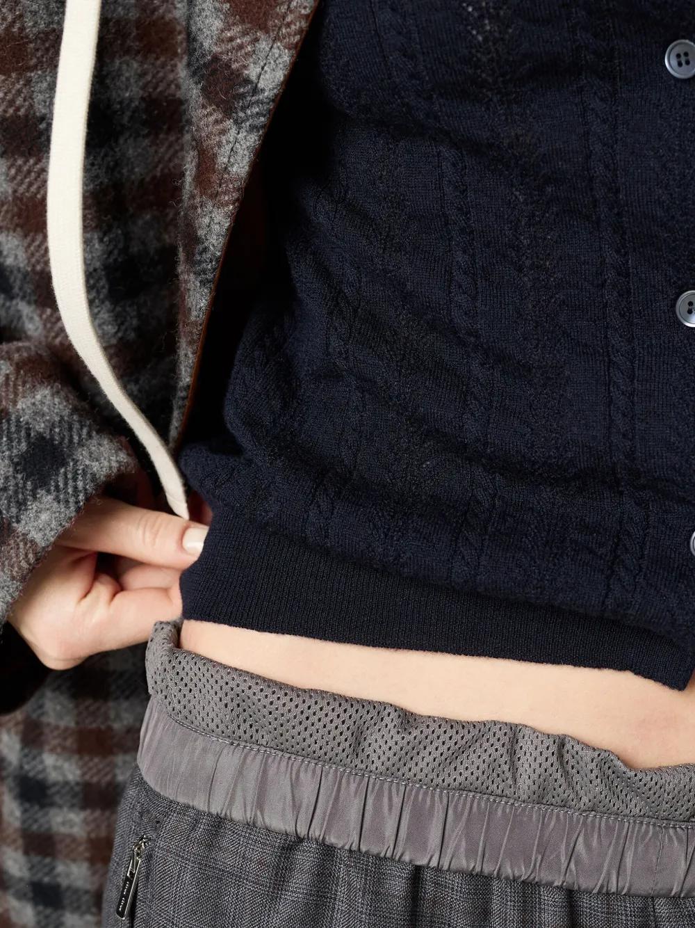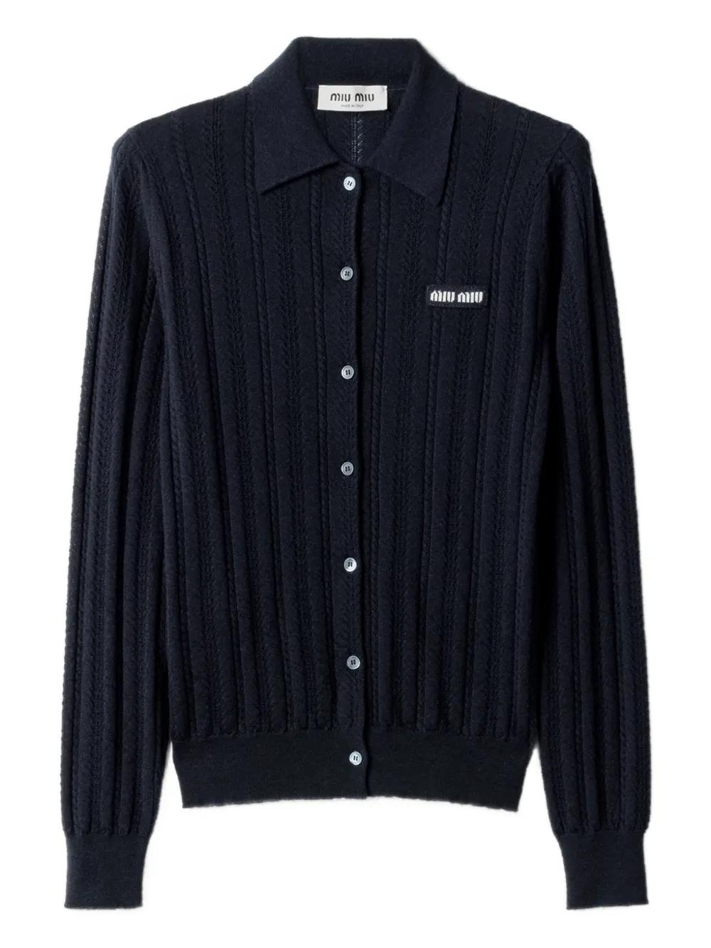 navy blue openwork knit ribbed-knit cuffs and hem front button closure logo patch
