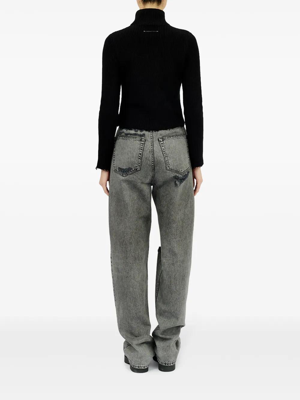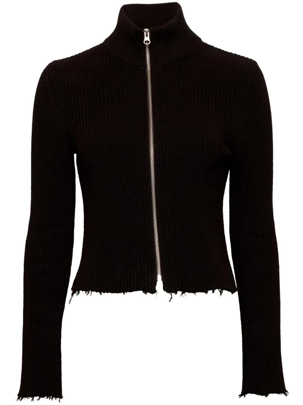 black cotton ribbed knit mock neck front zip fastening long sleeves raw-cut hem
