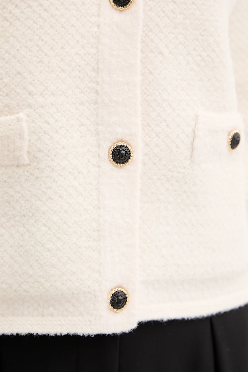 - Kardigan w fasonie regular zapewnia wygodę i uniwersalny wygląd. Delikatnie dopasowuje się do sylwetki, ale nie podkreśla jej nadmiernie. Klasyczny i prosty, sprawdzi się zarówno w eleganckich, jak i casualowych stylizacjach. - Zapięcie na guziki. - Cienka, elastyczna dzianina. - Długość rękawa: 62 cm. - Długość: 51 cm. - Szerokość pod pachami: 49 cm. - Wymiary podane dla rozmiaru: S.