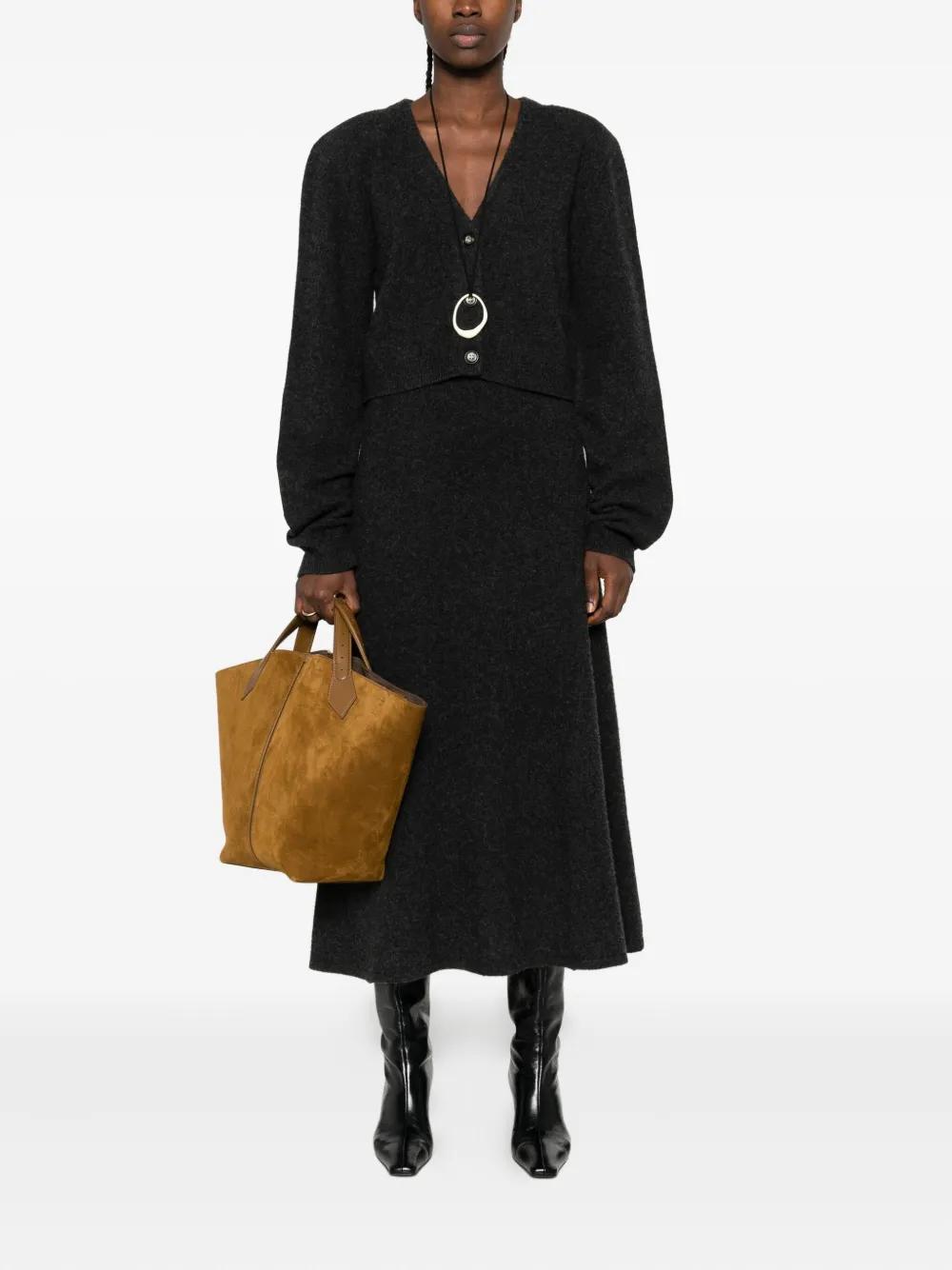 charcoal grey V-neck long sleeves button fastening cropped length ribbed cuffs