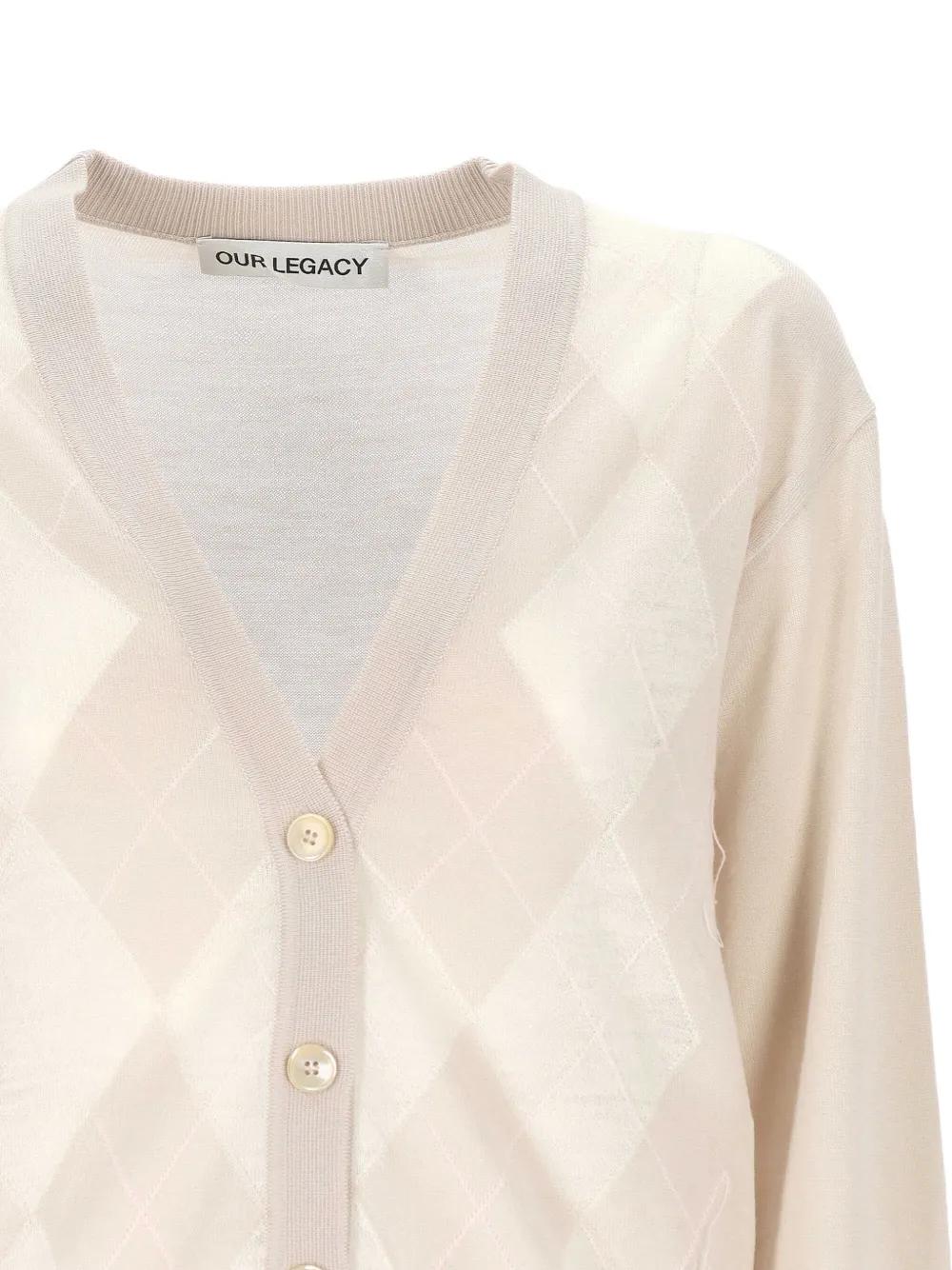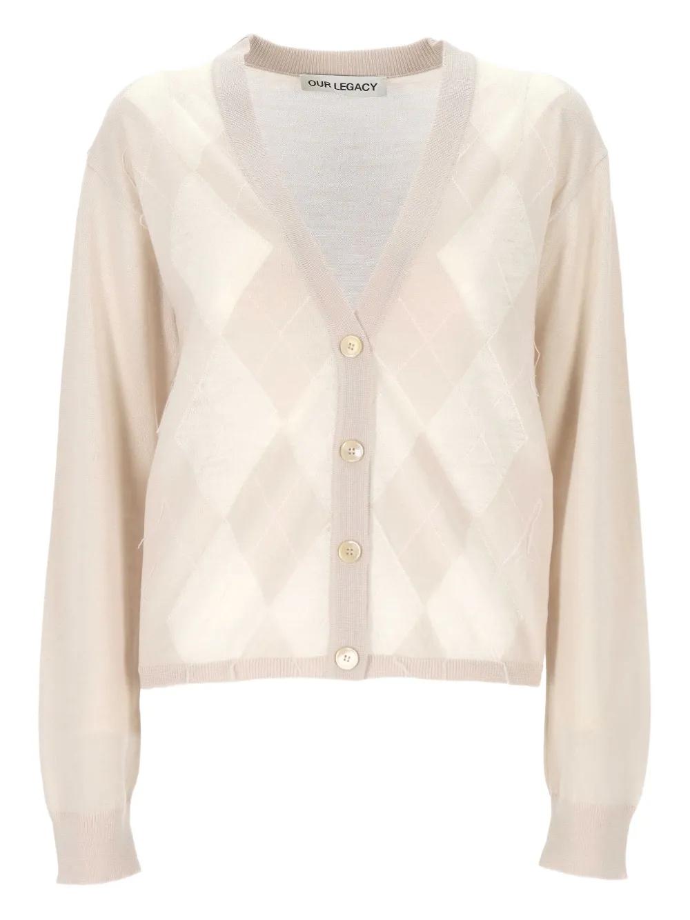 beige argyle pattern v-neck button fastening long sleeves ribbed hem