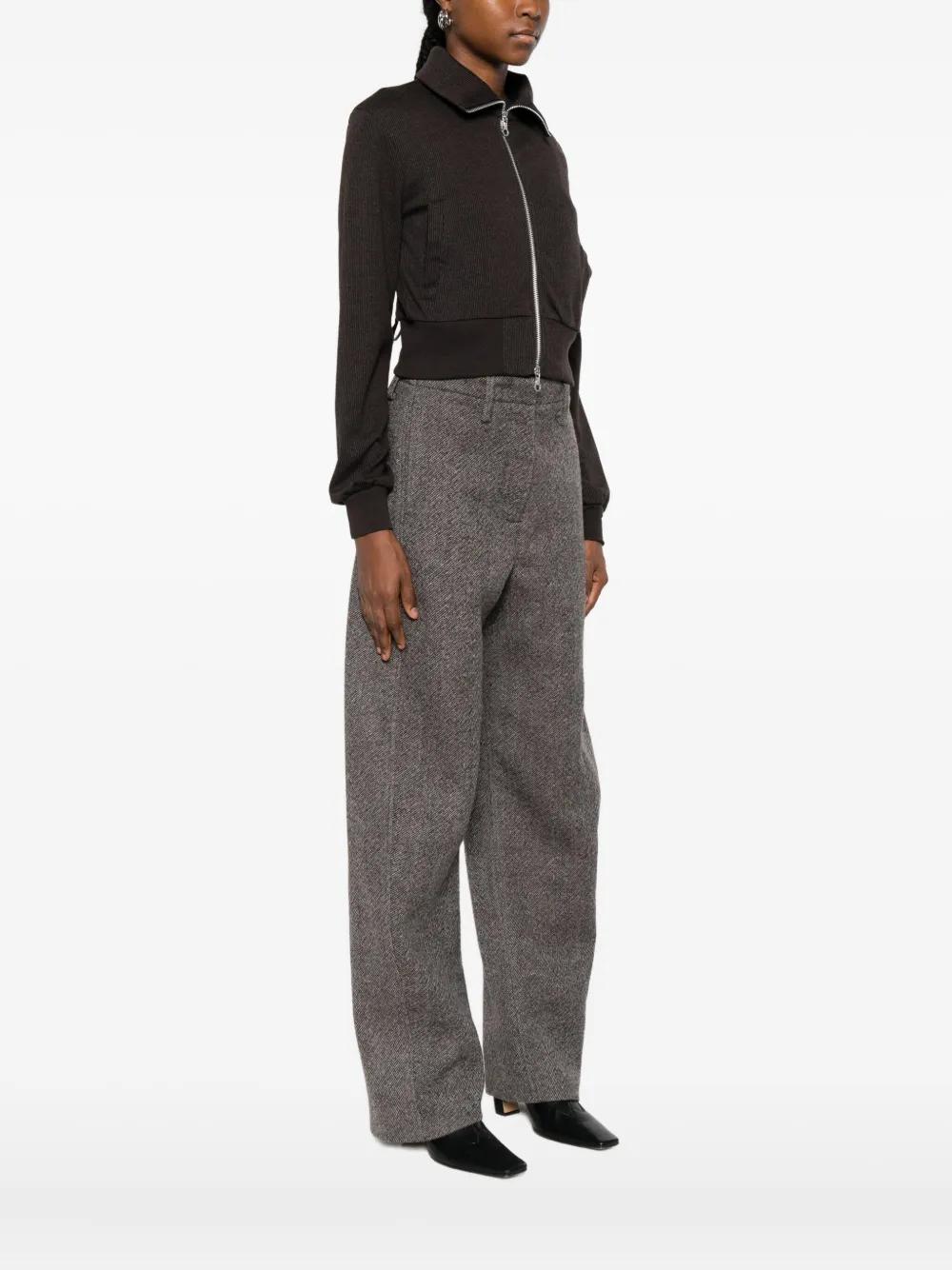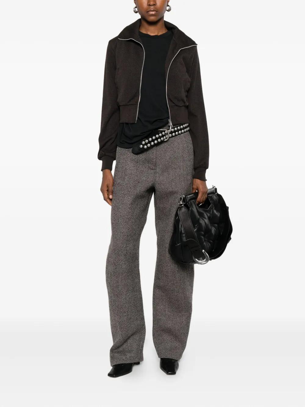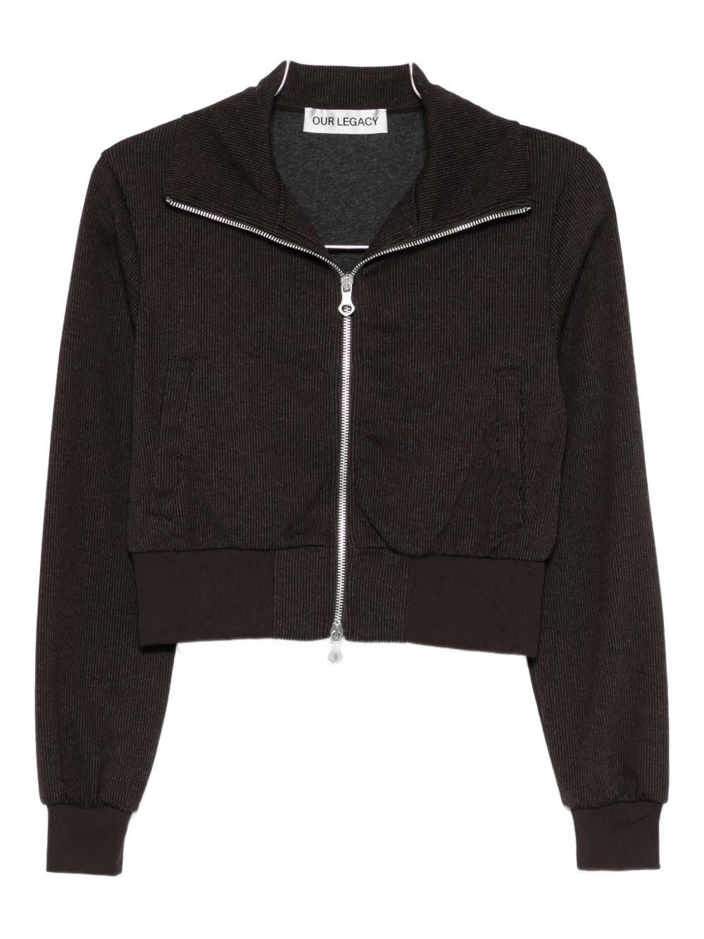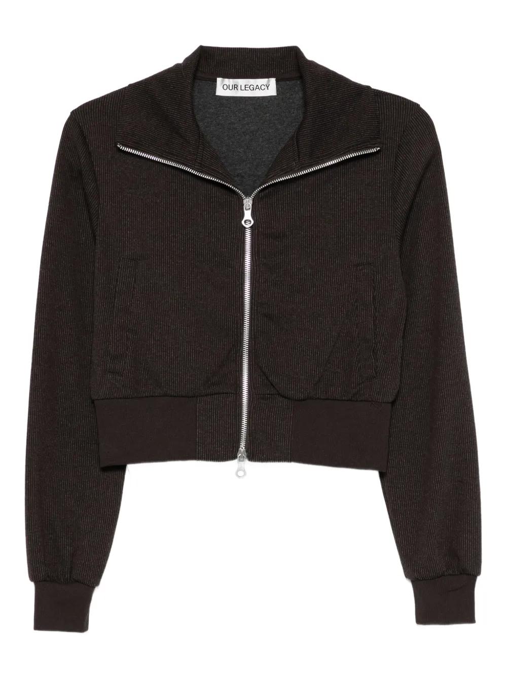 brown ribbed texture zip fastening stand-up collar front pockets ribbed hem